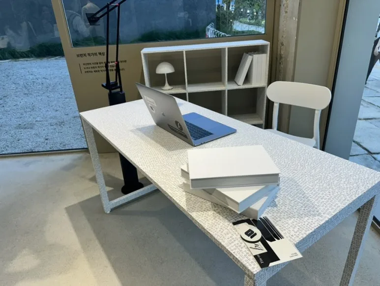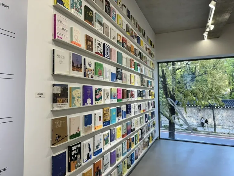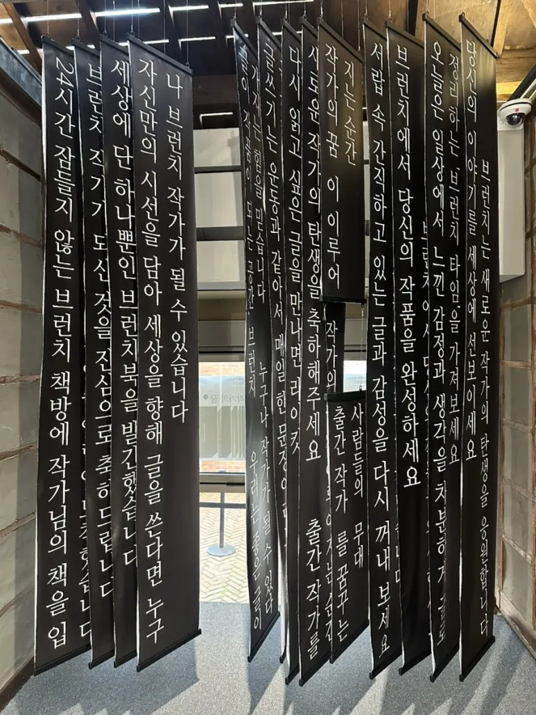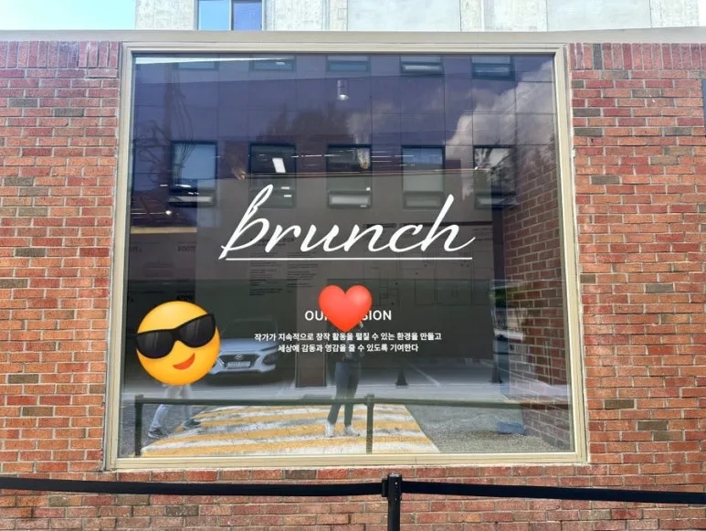 벽면 가득 자리한 브런치 책들. 창문 너머 보이는 햇살과 나뭇잎까지 참 좋았다.