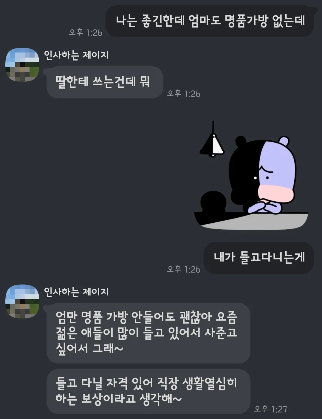 "엄마 명품가방 하나가 한 학기 등록금이야~"