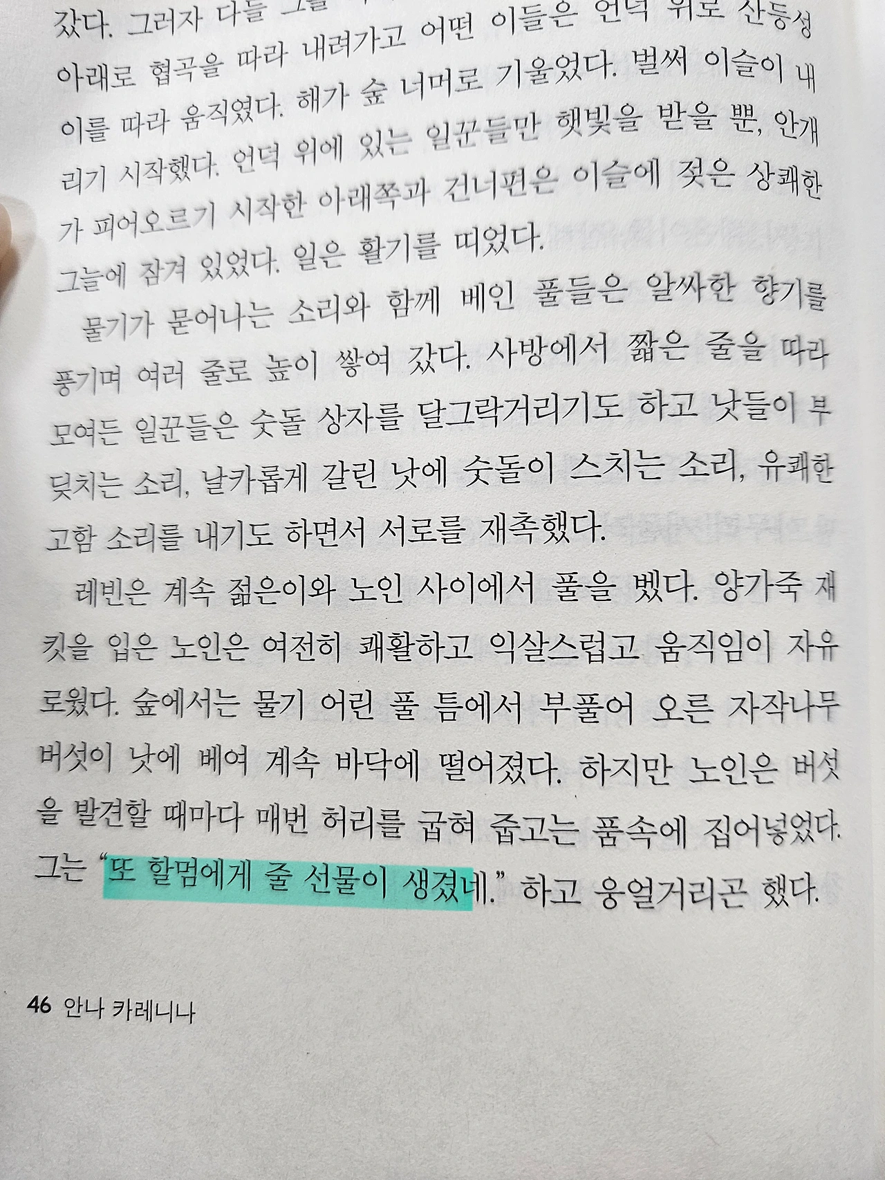 레빈이 거의 주인공으로 나오는 페이지들이었다. 좀 더 살펴보자면 그가 경영하는 농경지, 그 배경이 주인공 같았다. 러시아는... 분명 춥겠지만 읽으면서 따스한 느낌이 감돌았다. 책을 읽는 내가 주민 1이 되어 등장인물들 사이에서 숨 쉬고 흙냄새에 덮이는 느낌이었다. 수확을 위해 땅에 씨를 뿌리고 재배하는 시간들. 판매를 위해 가축을 기르고 돌보는 사람들. 보다 많은 수확물을 위해 농업경영을 고민하는 영주. 결혼으로 새로운 가정을 이루고 아이들을 낳고 기르는 과정.