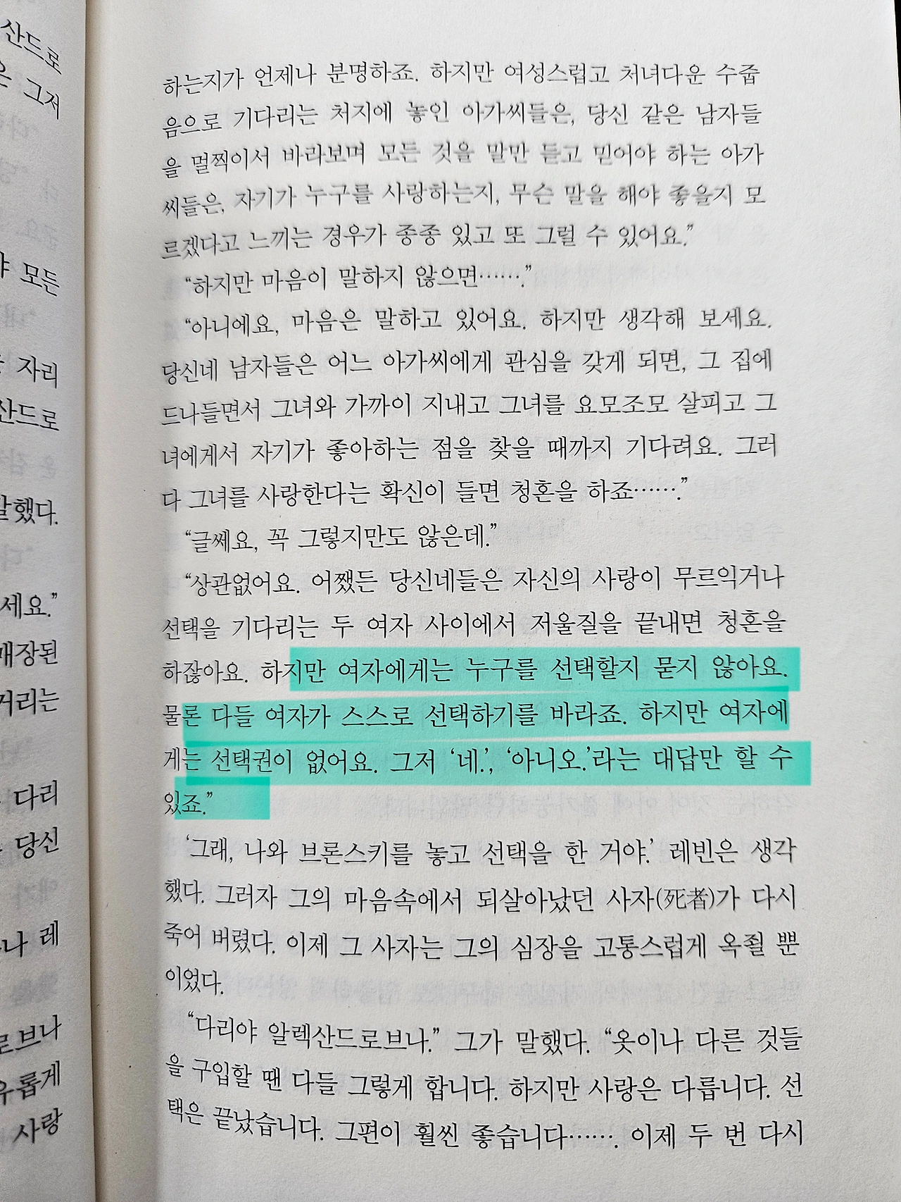 다수의 로맨스 소설과 영화를 통해 이런 결혼과정이 익숙해져, 여성의 '적극적 구애'란 전혀 존재하지 않았구나 새삼 깨달았다. 여자는 그저 자신에게 호감 있는 사람이 다가오기만을 기다려야 하는 운명이었다. 그래서 내가 좋아하는 사람이 나를 좋아해 주는 것은 기적, 그나마 괜찮은 사람이면 다행이고 이렇게 키티처럼 사교계에 나가지 못하고 정략결혼을 진행하는 건 운명이 정해져 있는 수순이니 얼마나 답답했을까.