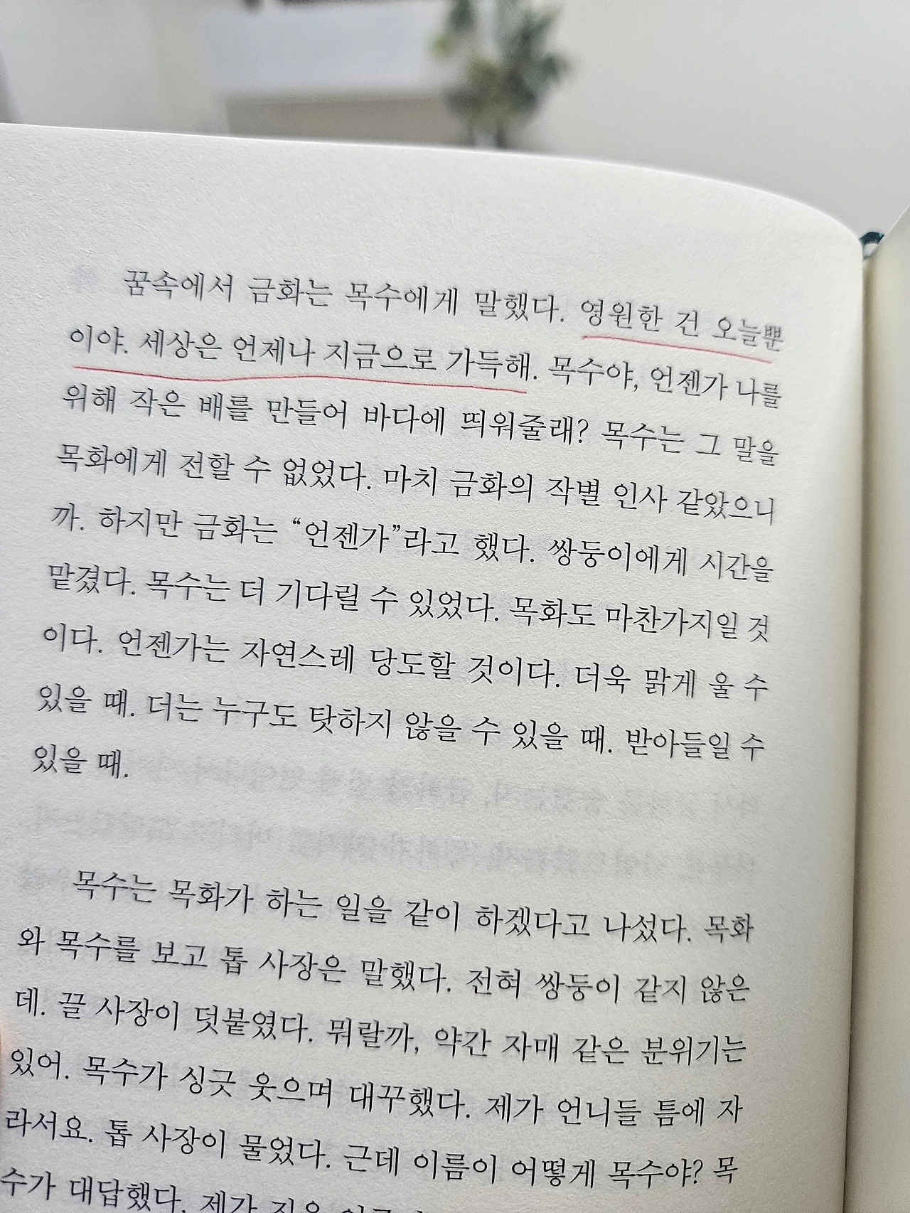 이외에도 참 좋은 문장들이 많았는데 그래서 많이 아쉬웠다. 문장들만 뽑아서 배치한 에세이북이라면 지루하다는 느낌이 없었을 텐데 소설로 이야기를 풀어가며 왜 이런 내용들이? 하면서 마치 뻥튀기 같은_약간 달면서 나름 맛있긴 한데 먹으면 공허한_페이지들이 많았다.