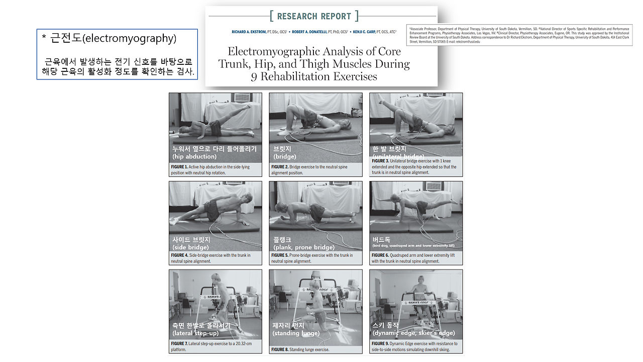 30명의 건강한 성인 참가자들을 대상으로 제시된 9가지의 하체 및 코어 운동 중 근전도 상에서 어떤 운동이 엉덩이 근육의 더 큰 활성화를 만들어내는지 확인하는 연구가 진행되었다. 근전도 검사는 근육에서 발생하는 전기 신호를 바탕으로 해당 근육의 활성화 정도를 알아볼 수 있는 검사이다. 결과에서 먼저, ‘중둔근 활성화’에는 9가지 운동 중 사이드-브릿지 운동이 가장 높은 활성도를 보여주었고, 한발 브릿지 운동이 그 뒤를 이었다. ‘대둔근 활성화’에서는 버드독, 한발 브릿지, 런지 운동 순으로 활성화 정도가 상위에 나타났다.