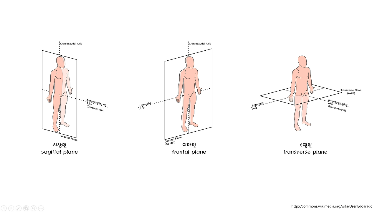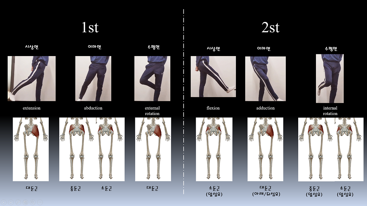 신체에는 기본적인 3가지 운동면이 있다. 인체에 그려지는 가상의 3개의 면을 타고 움직임이 나타나는데 사람의 몸을 좌우로 나눠 앞, 뒤로 이어진 면을 ‘시상면’, 사람의 몸을 앞, 뒤로 나눠 좌우로 이어진 면을 ‘이마면’, 사람의 몸을 위, 아래로 나눠 수평과 평행한 면을 ‘수평면’이라 한다. 대부분의 관절에서는 한 가지 혹은 두 가지 면에서 움직임이 나타나지만 고관절의 경우 3가지 면에서 모든 움직임을 만들어낼 수 있다. 그 움직임의 힘을 만들어내는 주요 근육에는 엉덩이 근육이 있다.