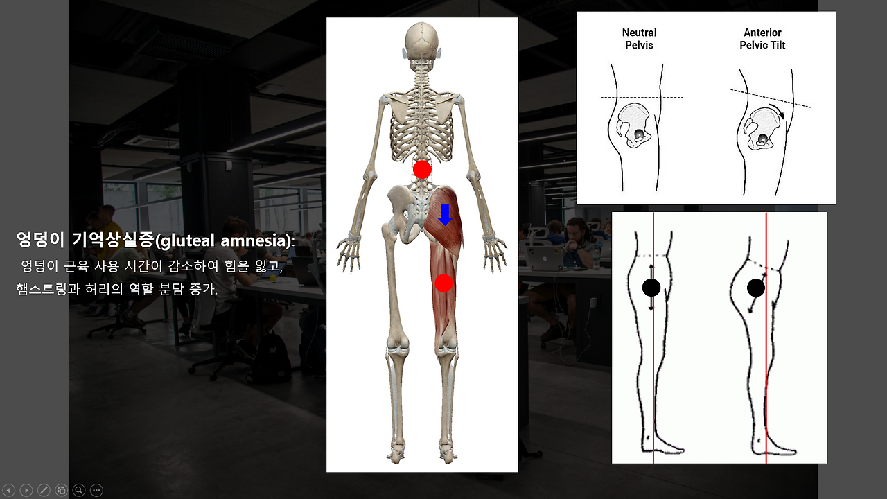 오랜 시간 동안 신체 활동 없이 의자에 앉아 있는 사람의 경우 엉덩이 근육의 힘을 잃고, 고관절 움직임에 대한 역할 분담이 허벅지 뒷 근육에만 떠넘겨지는 상태가 나타난다. 엉덩이가 약해지면 고관절이 앞으로 기울어진 채로 굳은 듯한 현상이 나타나고, 이러한 자세는 체중 중심이 고관절 앞쪽으로 지나면서 고관절에 가해지는 압박 부하를 적절하게 분산시킬 수 있는 능력이 저하된다. 허벅지 뒷 근육과 허리에도 부담이 증가되어 허리 통증이 발생할 수 있다. 척추 생체역학(the Spine Biomechanics) 분야의 권위자인 스튜어트 맥길(Stuart McGill) 교수는 이를 ‘엉덩이 기억상실증(gluteal amnesia)’이라고 불렀다. 앉아있는 시간이 길어진 현대인들에게 운동의 필요성을 설명하며, 엉덩이 근육은 직립 활동 중에 하지에서 척추로 힘을 전달하고, 체간을 바르게 유지하는 데 중요한 역할을 한다고 했다.