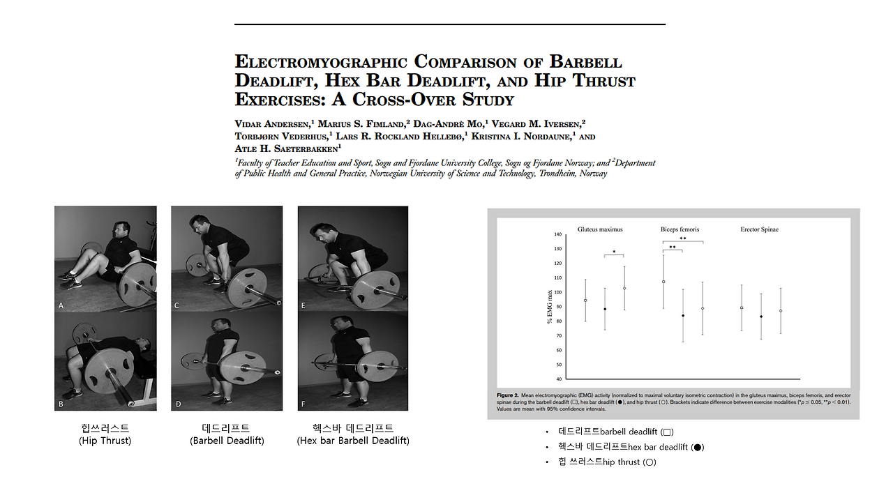 스쿼트 데드리프트, 힙 쓰러스트를 비교하면 힙 쓰러스트와 데드리프트가 스쿼트 보다 엉덩이 근육 활성화 수준이 더 높게 나타났다.