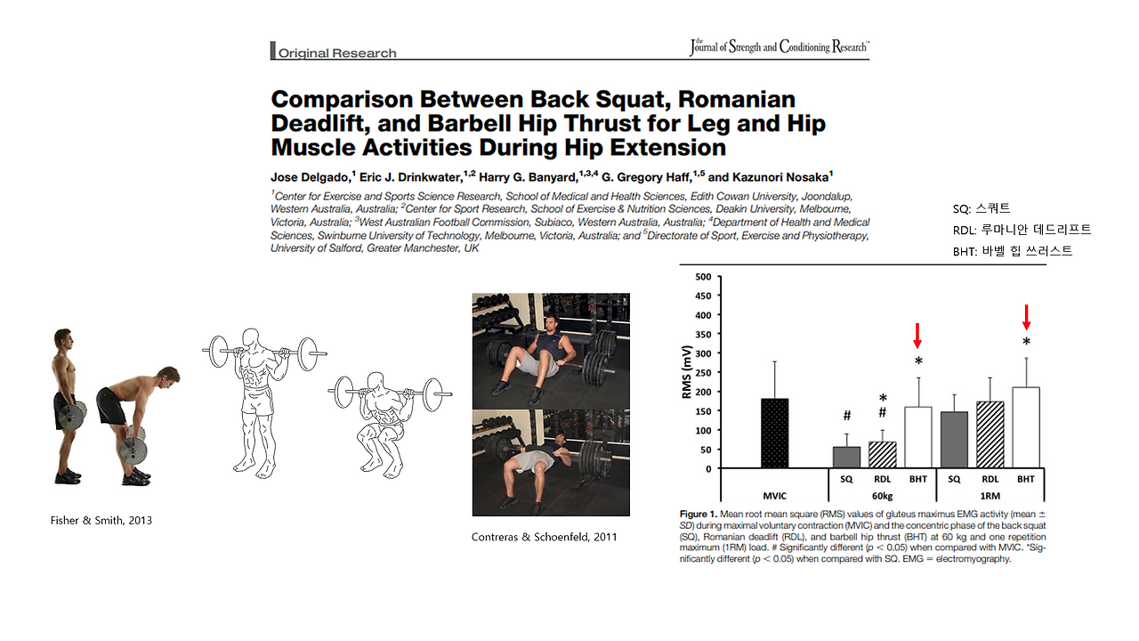 백 스쿼트, 루마니안 데드리프트, 힙 쓰러스트 운동을 비교한 연구에서는 BHT라고 표시된 힙 쓰러스트 운동이 스쿼트와 루마니안 데드리프트에 비해 대둔근 활성화가 더 높게 나타난 것을 볼 수 있었다.