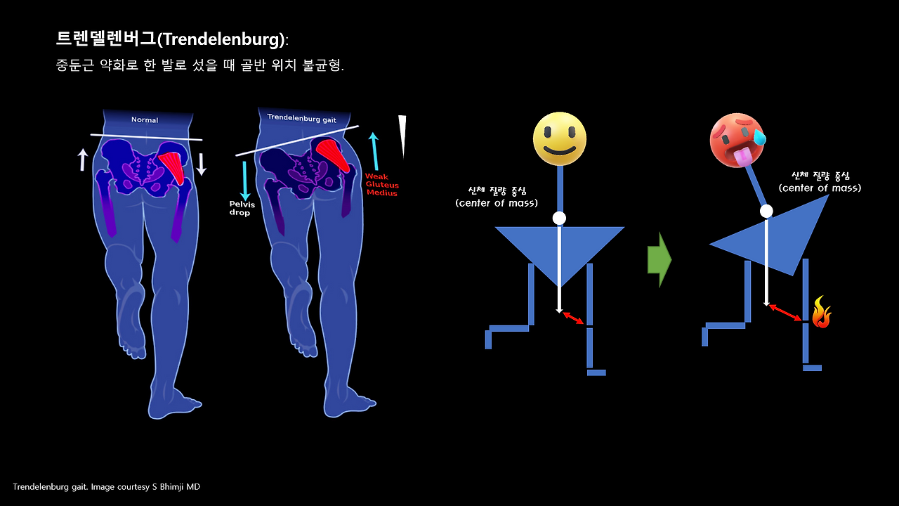 엉덩이 근육 중 하나이며, 바깥으로 벌리는 동작을 담당하는 중둔근(gluteus medius/minimus)은 한 발로 서 있는 자세 동안 골반의 주요 안전장치이다. 사람이 서 있는 자세에서 한 발을 들어 올렸을 때 지지하고 있는 발 쪽의 중둔근이 정상적인 사람이라면 되도록 평행한 골반 위치를 유지한다. 하지만 중둔근의 현저한 약화가 있다면 지지하는 발 쪽의 골반이 균형을 유지하지 못하고, 올라가게 된다. 마찬가지로 걷는 동작 중에도 골반과 체간을 유지하지 못하여 엉덩이가 양 옆으로 과도하게 빠지며 걷는 모습이 나타날 수 있다. 이는 신체의 질량 중심을 무릎 관절 중심에서 멀어지게 하고 무릎은 이를 버티기 위해 그만큼 가해지는 압력이 높아지게 된다.