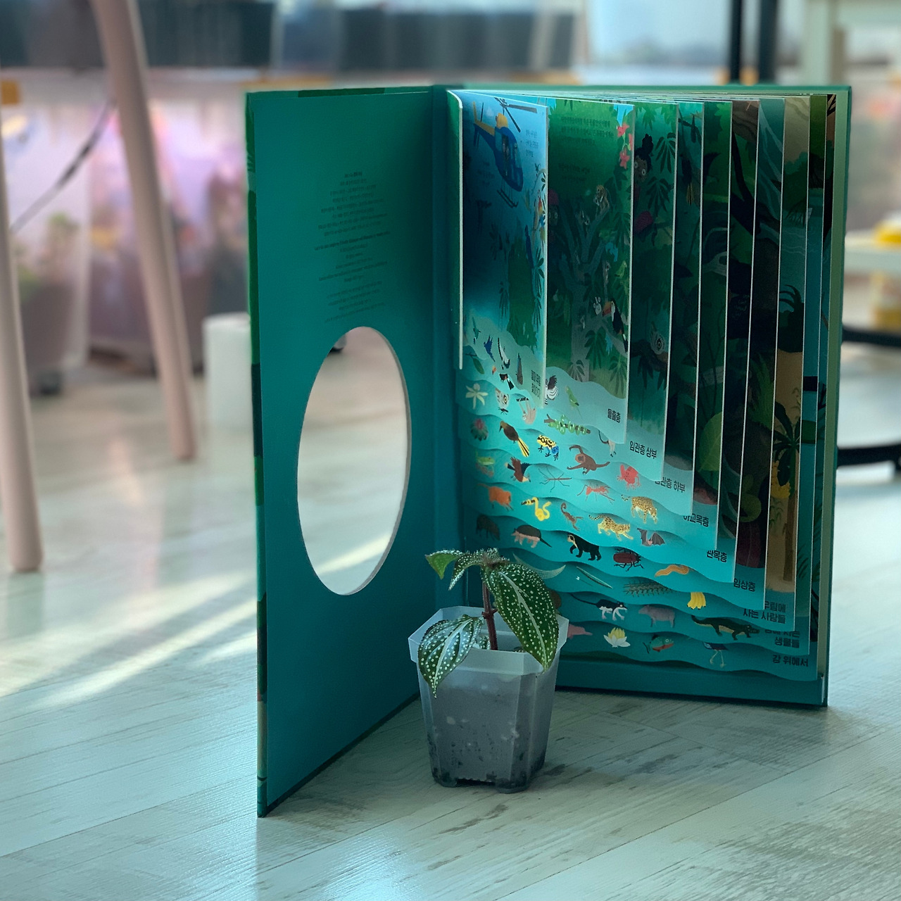 그럼에도 이러한 가로본능을 세로질러 가는 책이 있다면, 그중 하나가 <Let's Go 열대 우림>이다. 누구보다 창의적인 독자를 대상으로 하는 동화로서 실험적인 북디자인을 보여준 점도 있지만, 이 책의 북디자인은 사실상 실험보다는 효율에 중점을 두고 있다. 왜냐하면 이 책의 '가로지르기'는 열대 우림을 설명하기 위해 무엇보다 적합한 방식을 택한 모습이기 때문이다.