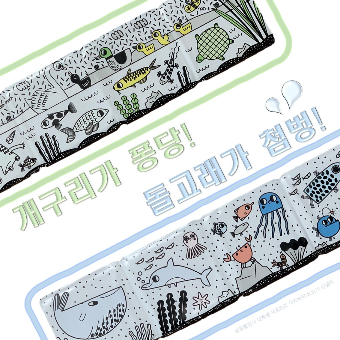 책의 변화 중 물과의 만남이 이 책만의 생각은 아니지만(종이와 더 유사한 질감의 돌 소재로도 바캉스용 책을 만든 케이스도 있다.)언제나 북디자인이 행하는 신선한 시도의 일환 중 가장 도전적이다. 어린 독자들에게 <돌고래가 첨벙!>과 <개구리가 퐁당!>은 장난감으로서 다가간다. 책과의 만남이 인위적이지도, 강제적이지도 않게 말이다.