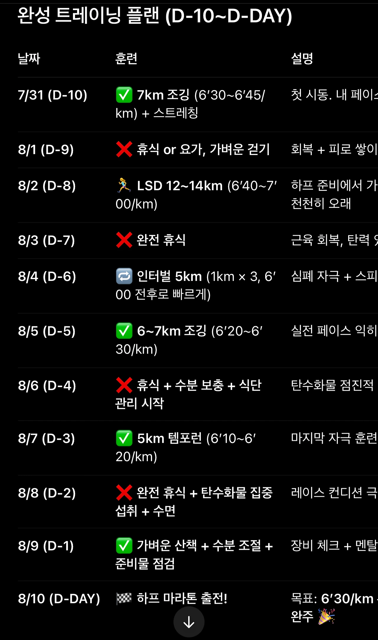 10일 전부터 하루하루 계획된 훈련 스케줄, 조깅과 인터벌, 수분 조절, 식단까지…