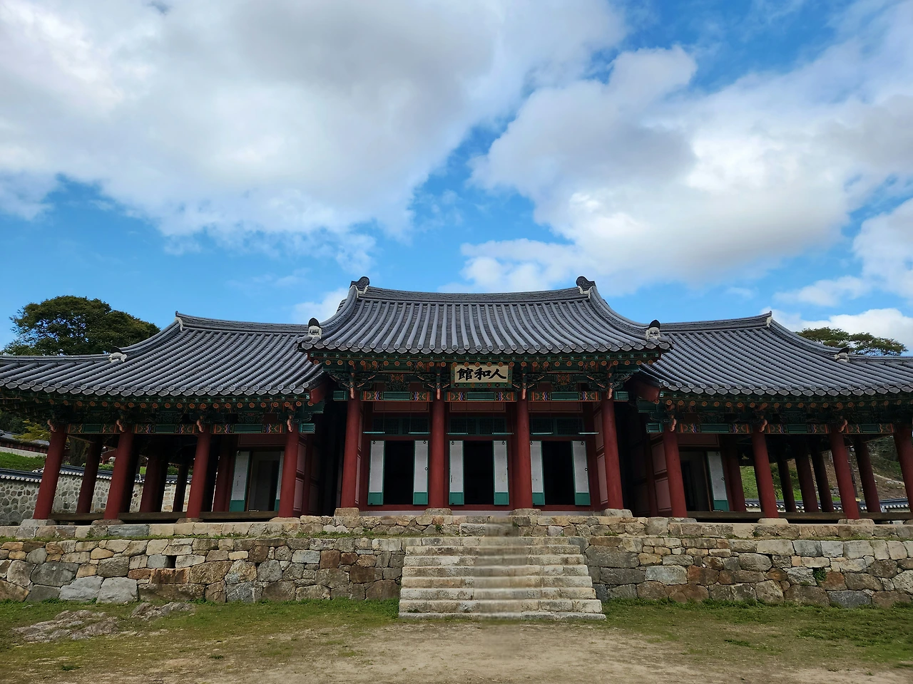 길을 따라 걷다 문득 눈길이 머문 곳은 인화관(人和館)이었다. 사람이 화합하는 집, 조화로운 사람들이 모이는 곳이란 따뜻한 의미를 지닌 공간이었다. 잠시 들른 인화관 앞에서 늦가을 햇살이 유난히 따스하게 내려앉았다. 화려하면서도 단정한 단청이 햇살을 머금고 있었다. 초록의 숨결 위로 붉은 기둥이 하늘을 떠받치고 있는 모습은 마치 세월이 빚은 기도의 형상 같았다.