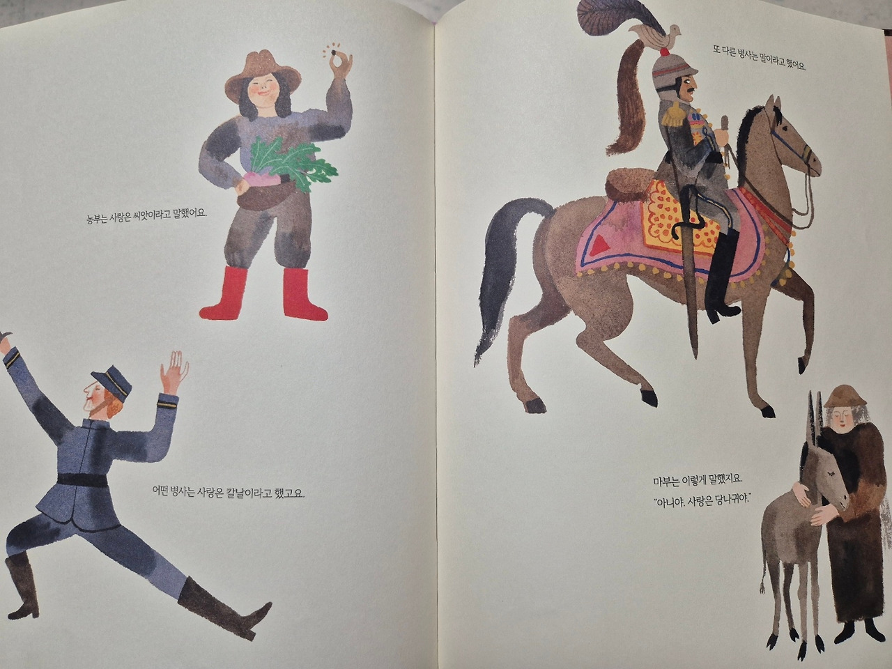 소년이 만난 사람들은 사랑을 물고기, 씨앗, 칼날, 말 같은 동물 또는 사물에 비유합니다.