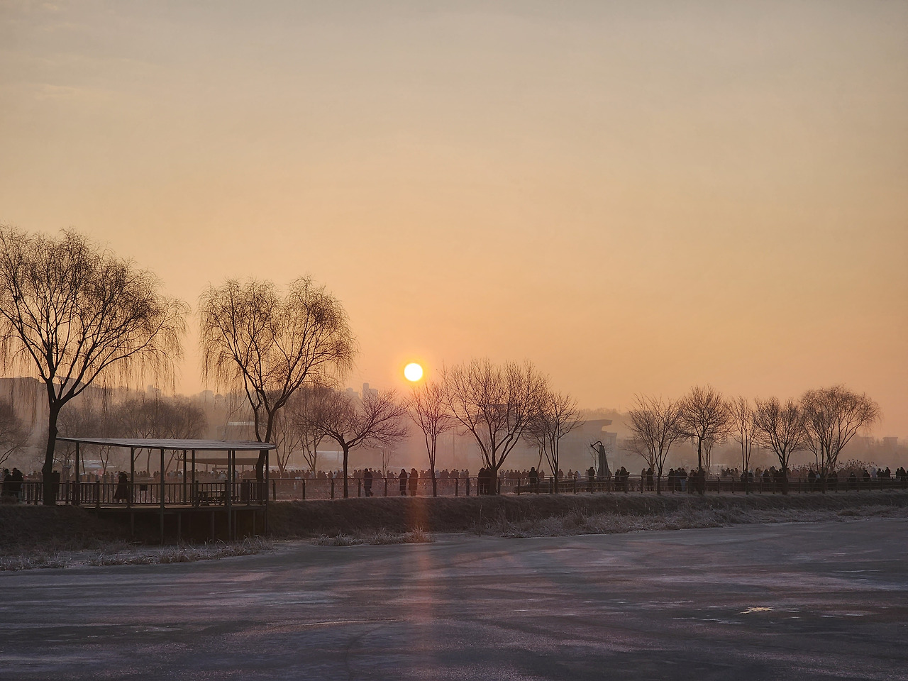 남편과 나는 좀 먼 주차장에 차를 대고 지호 손을 잡고 뛰었다. 좀 느긋이 달리다가 갑자기 주변이 밝아지는 것 같아서 점점 속도를 높였다. 나중에는 거의 전속력으로 달렸다. 아.. 어제 많이 걸어서 허벅지가 욱신거린다. 그래도 힘을 내서 해돋이 장소를 향해 달렸다. 생각보다 멀었는데, 지호는 혹시 해가 뜰까봐 애태우면서 앞서 뛰어가고 있다. 근처에 도착하자 일이천명은 족히 되어 보이는 사람들이 호수를 에워싸고 모여 있었다. 그리고 익숙한 소리가 들려온다. "의왕시민여러부운.... “ 멀리서 시장님이 마이크 잡은 소리가 들리는 걸 보니 잘 찾아온 것 같다.