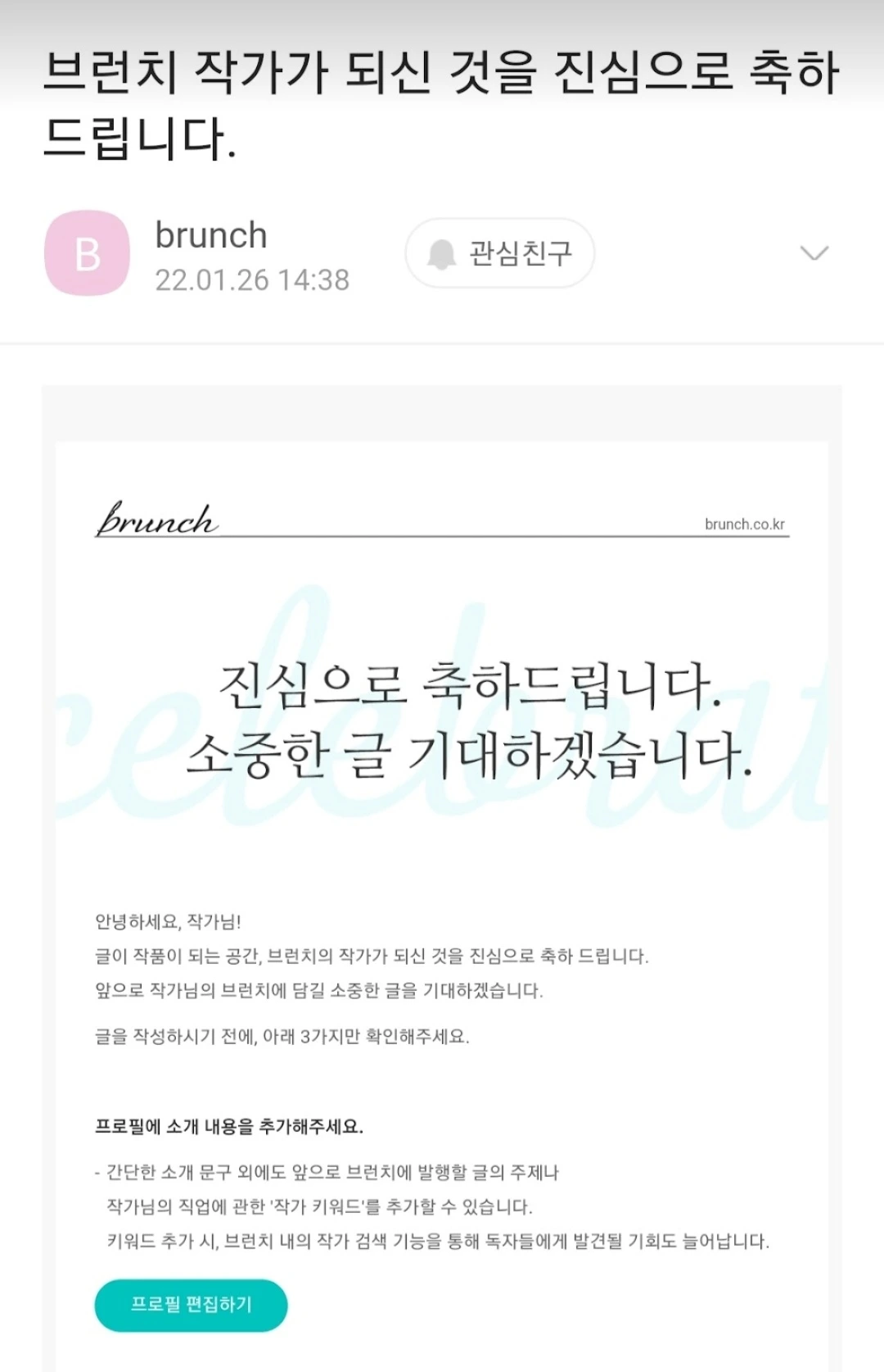브런치에서 알림 문자 하나가 왔다.