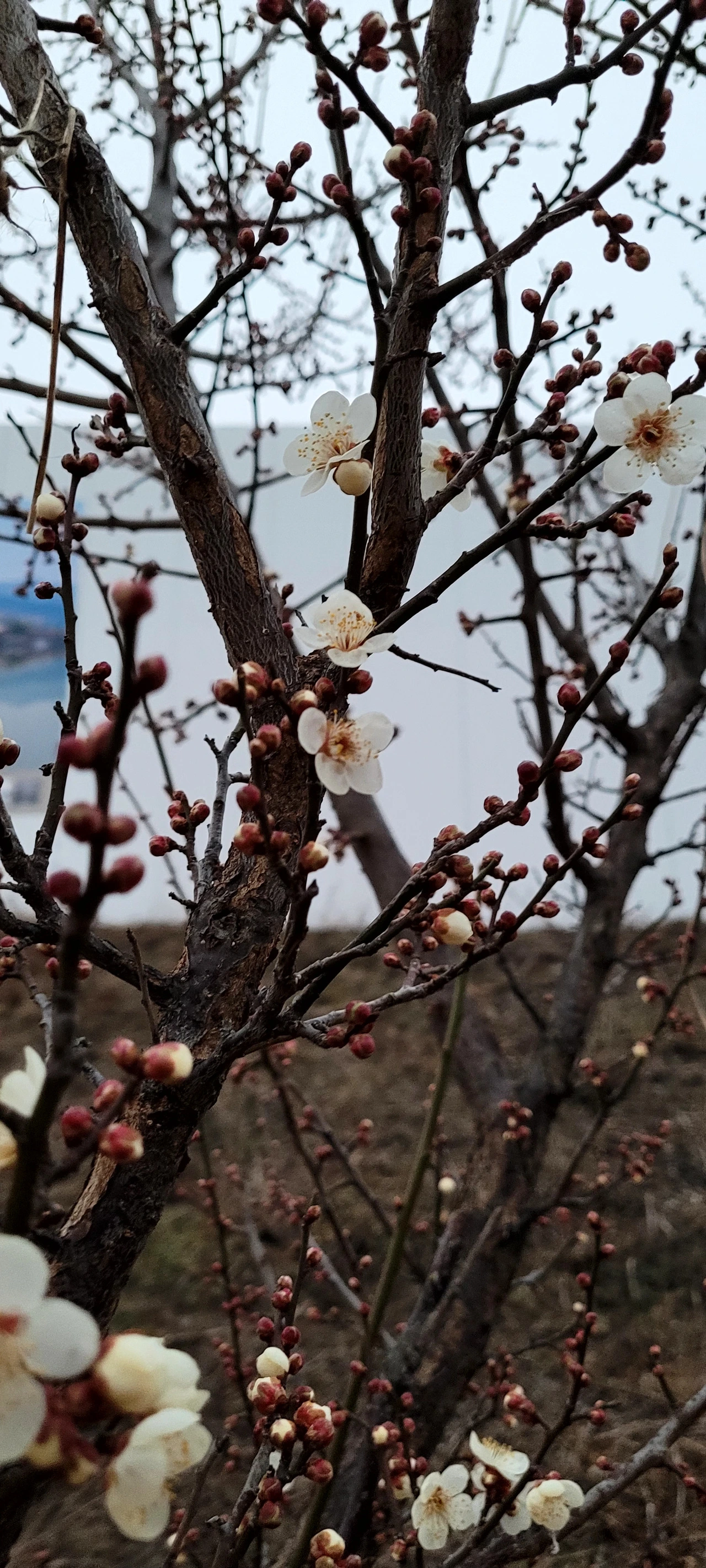 키 작은 바위 조금 위에 키 작은 매화나무에 작고 앙증맞은 매화꽃이 10송이 남짓 피어있다.