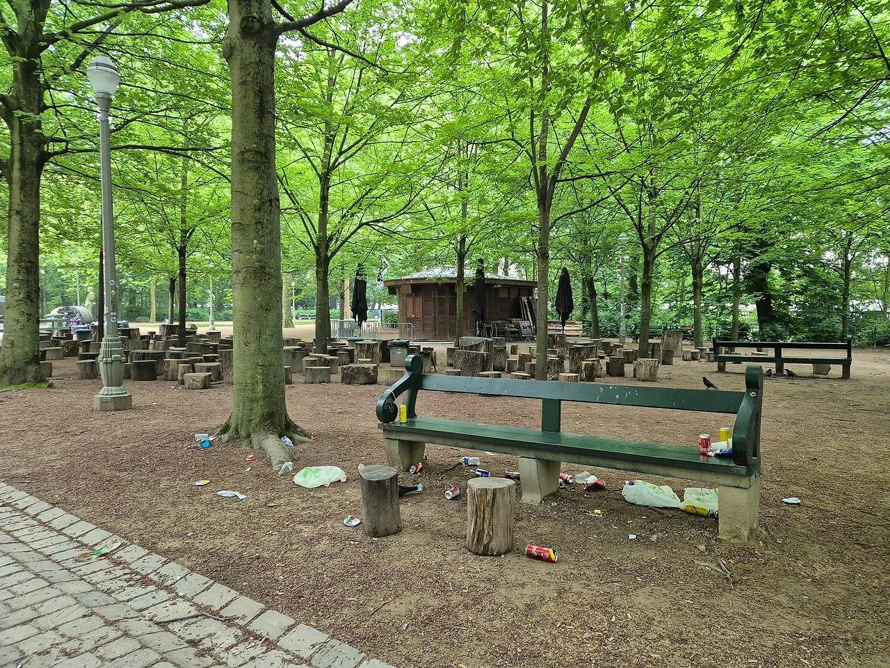 브뤼헤에 다녀오기 위해 숙소를 나섰다. 숙소 앞에 있는 브뤼셀공원은 14세기에 왕족들이 사냥을 즐겼던 곳으로 브뤼셀왕궁과 나란히 연해 있었다. 어제저녁에 지날 때 보니 공원 한쪽에 오픈바가 있어서 술을 마시며 즐기는 사람들로 클럽을 방불케 했는데 그 요란했던 흔적이 공원 곳곳에 남아 있었다.