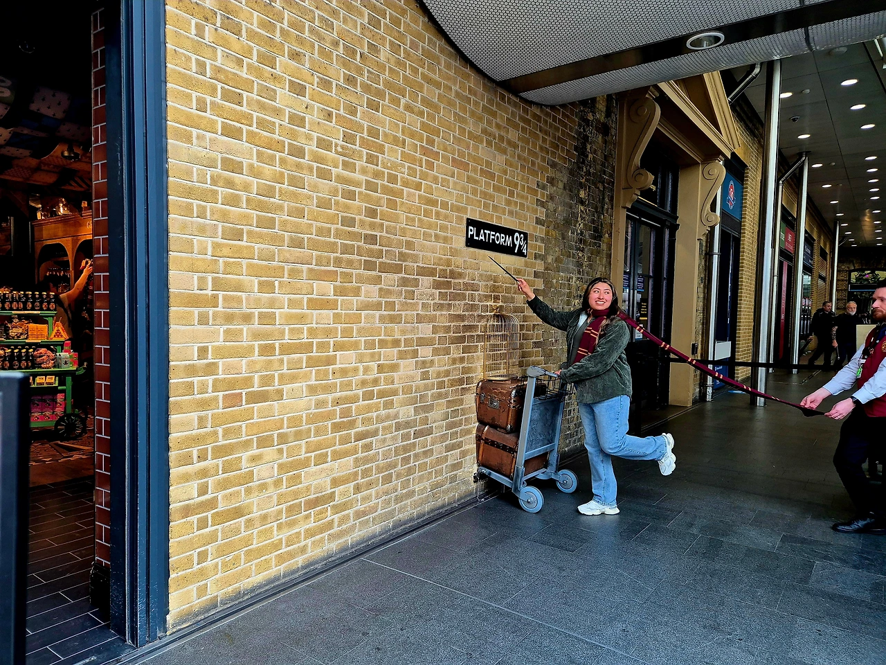 플랫폼이 다른 건물에 위치해 있어 가방을 끌고 열심히 찾아갔는데 호그와트행 플랫폼은 다시 개찰구를 통과해야 접근이 가능해 보였다. 그런데 개찰구 너머 플랫폼에는 북적여야 할 사람들이 보이지 않았다. 개찰구 옆에 서 있는 직원에게 물으니 등 뒤를 가리켰다. 돌아보니 많은 사람들이 일제히 한 곳을 향해 서 있었는데 바로 그곳에 해리포터가 기둥으로 밀어 넣었던 카트가 벽에 꽂혀 있는게 아닌가. 해리포터 굿즈를 판매하고 있는 가게의 외벽이었다. 사람들은 줄을 서서 가게직원들의 안내에 따라 사진을 찍고 있었다. 이런! 너무 순진한 기대를 품었었나?