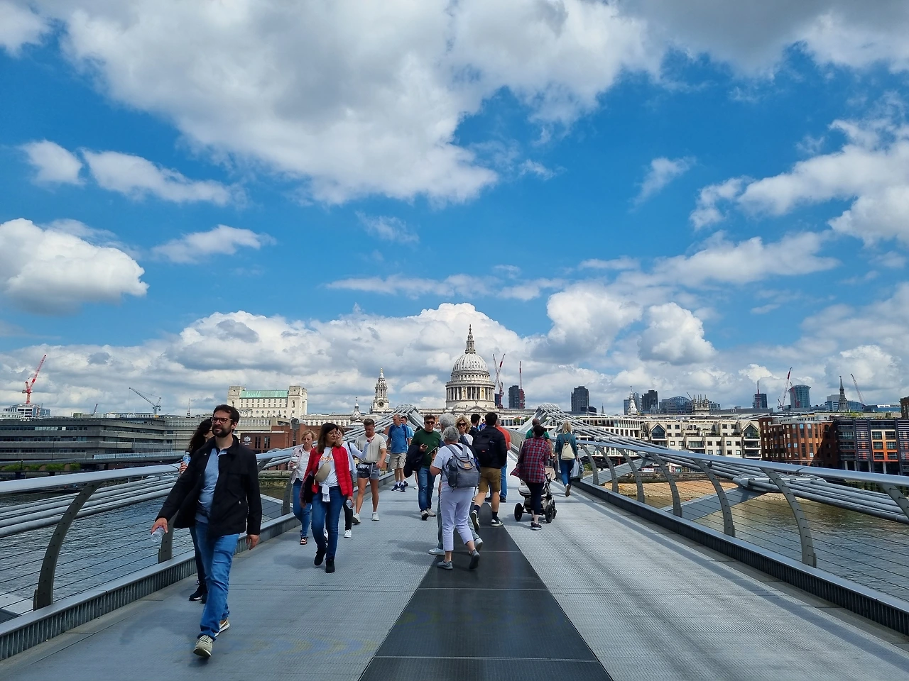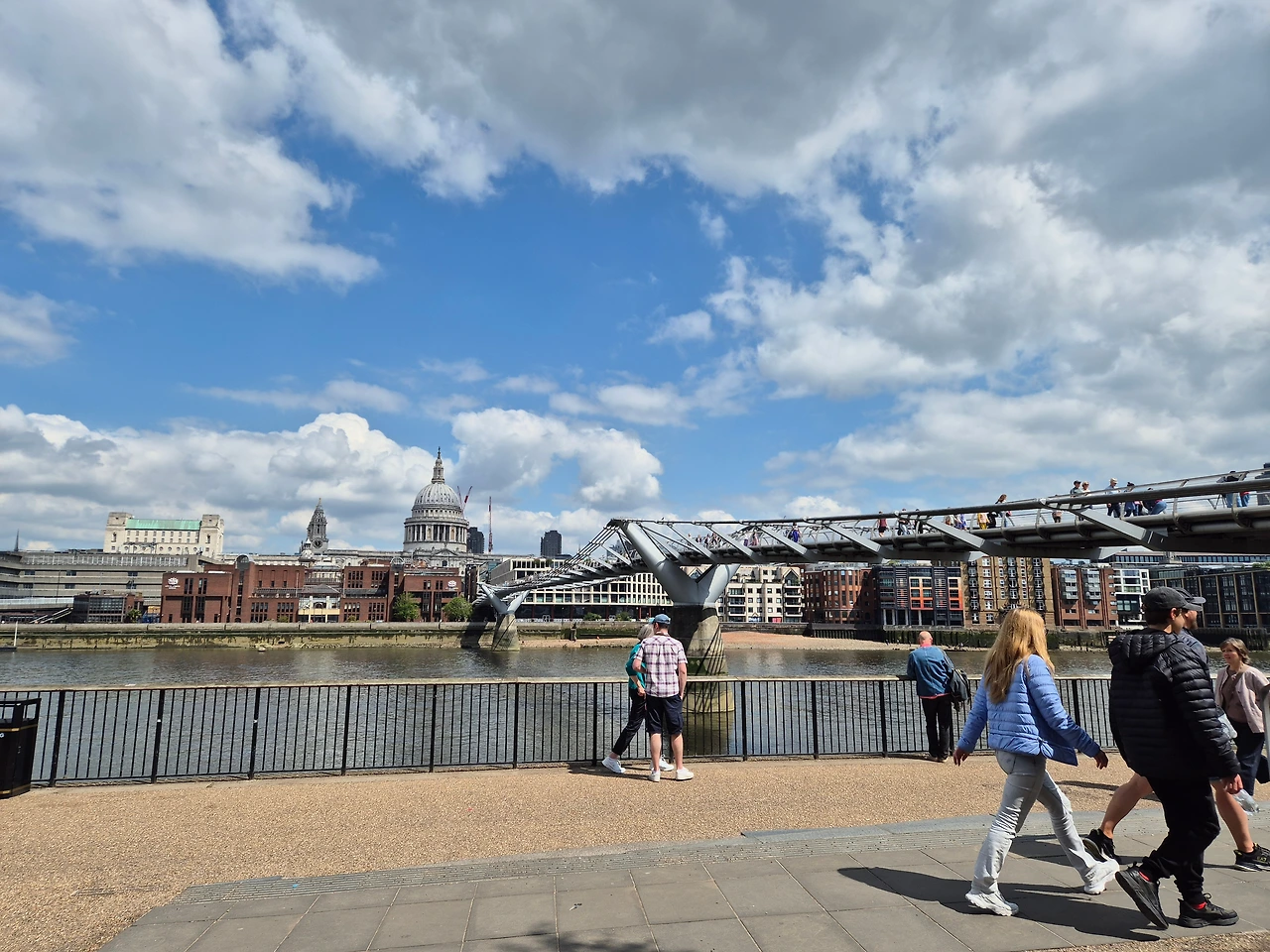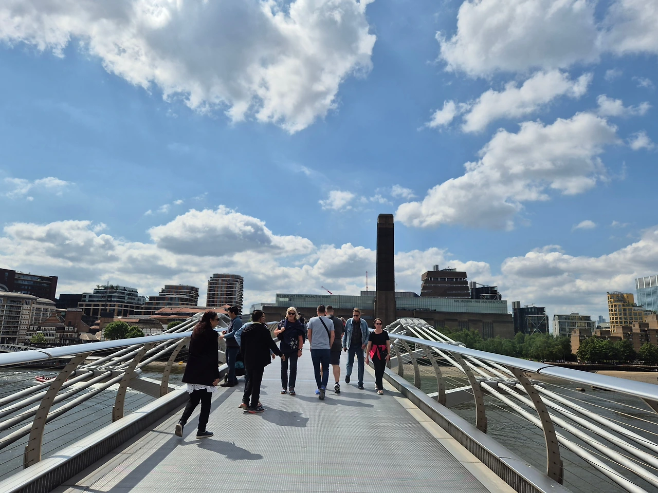세인트폴 대성당을 나와 템즈 강 쪽으로 걸었다. 런던에서 제일 궁금했던 곳은 밀레니엄 브리지와 테이트 모던이었는데 세인트폴 대성당에서 조금만 걸으면 2000년을 기념해 세워진 밀레니엄 브리지로 이어졌다. 템즈강 위로 세인트폴 대성당과 테이트 모던을 연결하고 있는 밀레니엄 브리지는 차가 다니지 않는, 사람을 위해 설계된 보행자 중심의 다리이다.