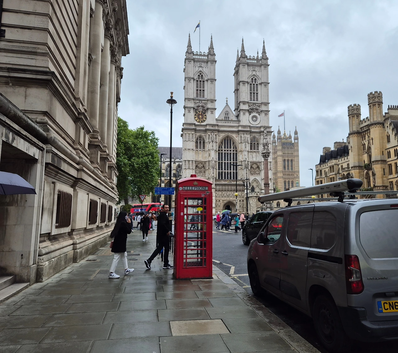 기마병들의 행렬이 눈앞에서 멀어지는 것을 확인하고 우리도 버킹엄궁을 벗어나 웨스트 민스터 사원을 향해 걸었다. 조금 걸으니 저만치 빨간색 공중전화박스가 보이고 그 길 끝에 언뜻 노트르담 대성당과 닮아 보이는 웨스트민스터 사원이 있었다. 그러니까 영국 하면 떠오르는 이미지들이 촤르르 보이기 시작했다는 것. 빨간색 공중전화박스, 빅벤, 국회의사당, 런던아이, 거기에 흐린 하늘까지 여러 매체를 통해 익히 보았던 이미지들이 차례로 시야에 들어와 박혔다. 컨디션만 좋았다면 공중전화박스 안으로 들어가 누군가에게 전화를 거는 시늉정도는 해봤을 텐데.