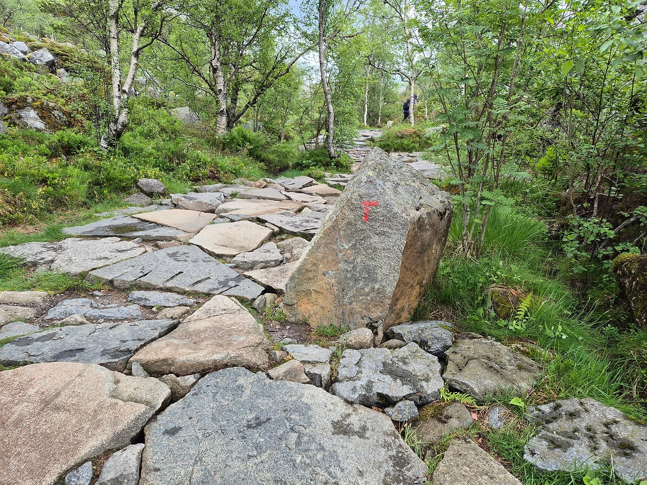 비는 살짝 바닥만 적시고 지나갔다. 콧물 이슈로 콧물을 닦고 푸느라 정신이 없는 와중에도 눈앞에 펼쳐지는 이색적인 풍경을 연신 눈에 담았다. 프레이케스톨렌으로 가는 길은 바위에 붉은색 'T'로 표시되어 있었다. 사람들이 많을 때는 줄을 서서 오르기도 한다는데 우리가 걸었던 날은 드문드문 마주쳤다.