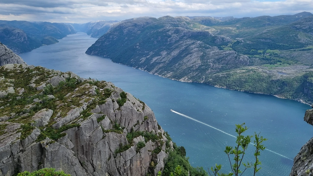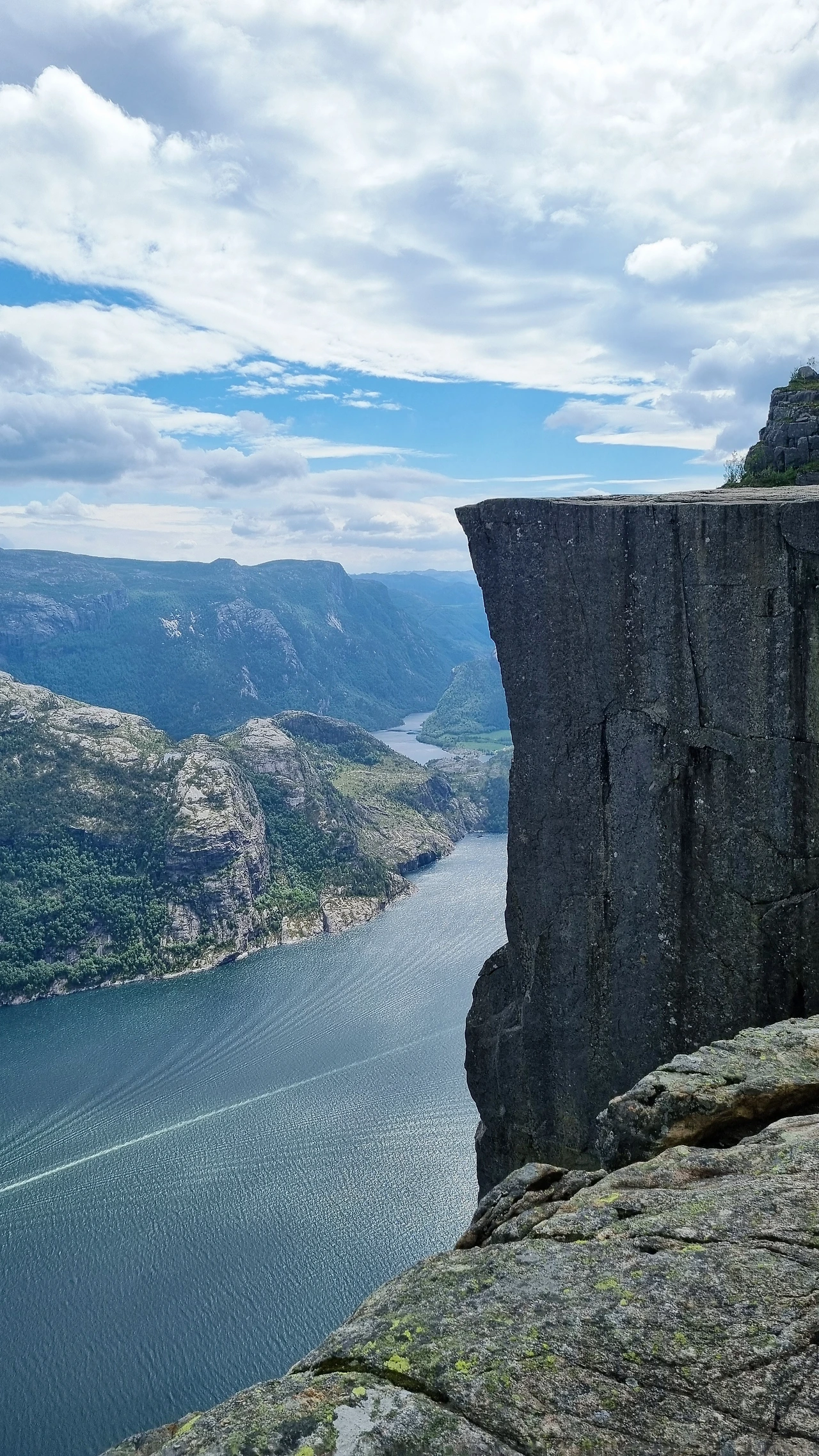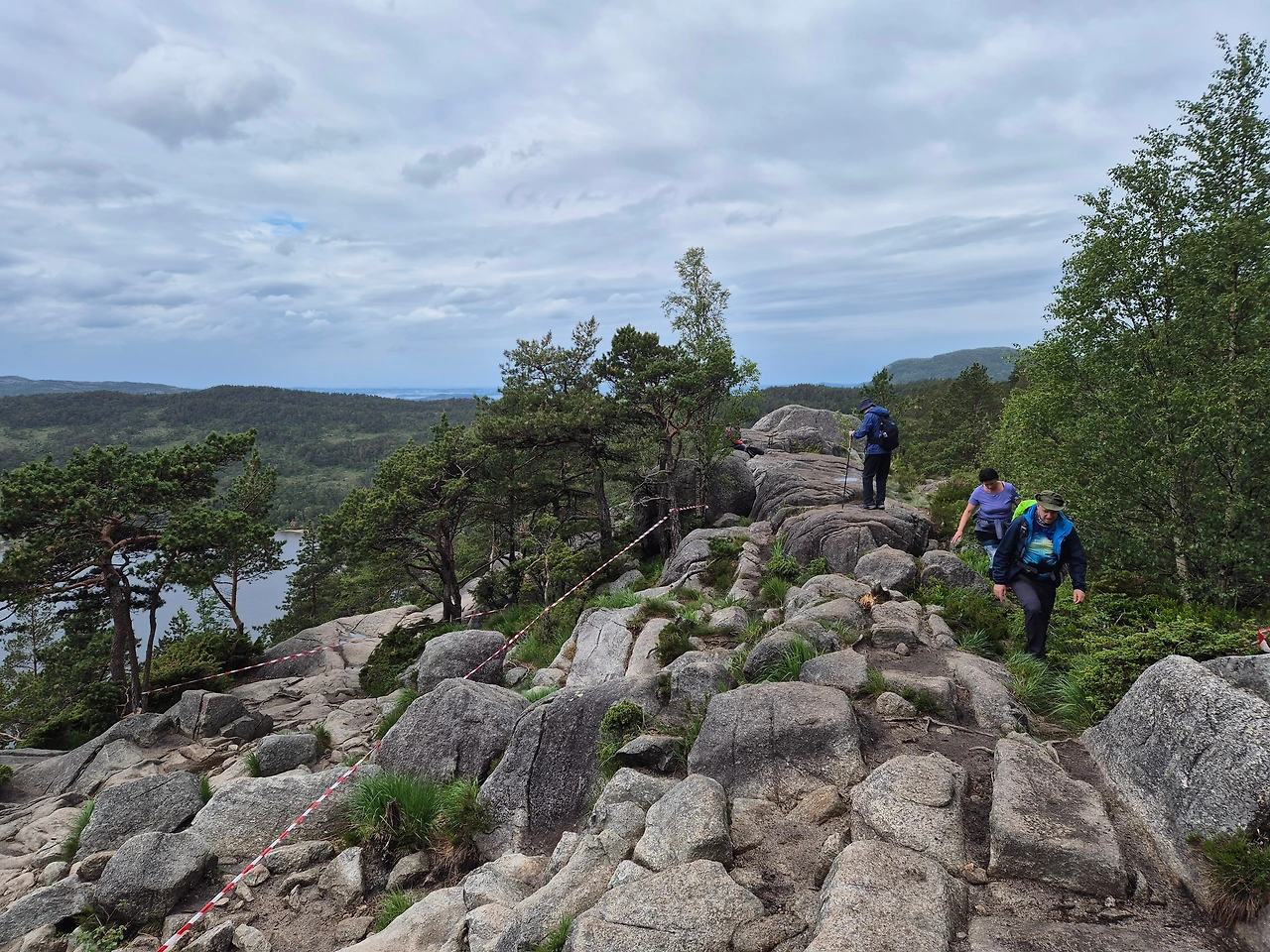 한국과 다른 수종과 바위가 만들어내는 풍경, 오른 지 얼마 되지 않아 마주친 호수, 비를 품은 구름들이 넘나드는 바위 언덕을 오르며 북유럽의 대자연 속에 있다는 자각이 가슴 깊이 스며들었다. 그렇게 2시간 남짓 올랐을까. 산마루가 뚝 끊어지며 천길 낭떠러지 아래 깊이를 가늠할 수 없는 뤼세 피오르가 나타났다. 그리고 프레이케스톨렌이 우뚝 시야를 막아섰다.