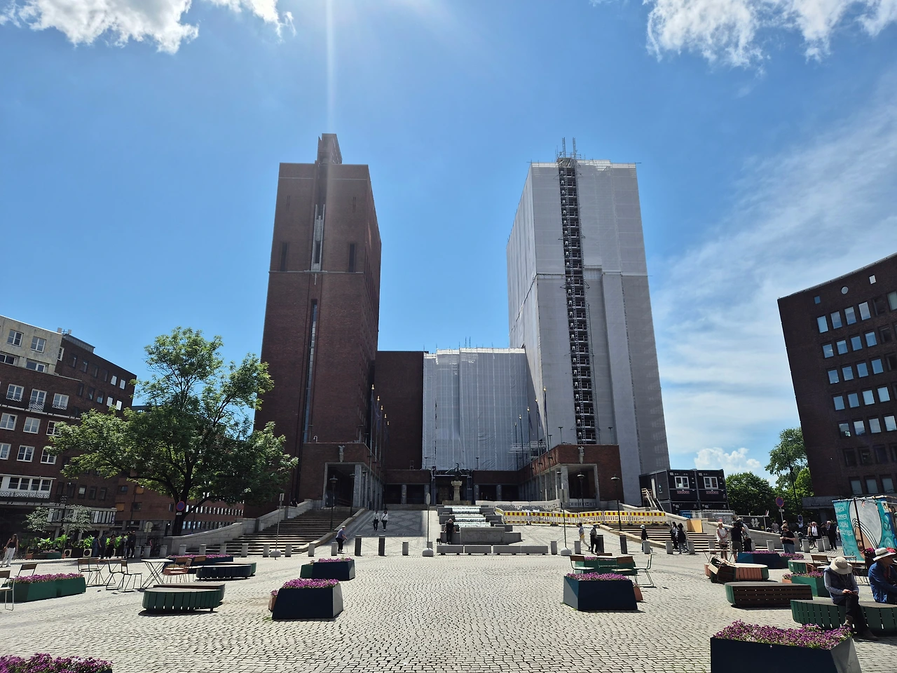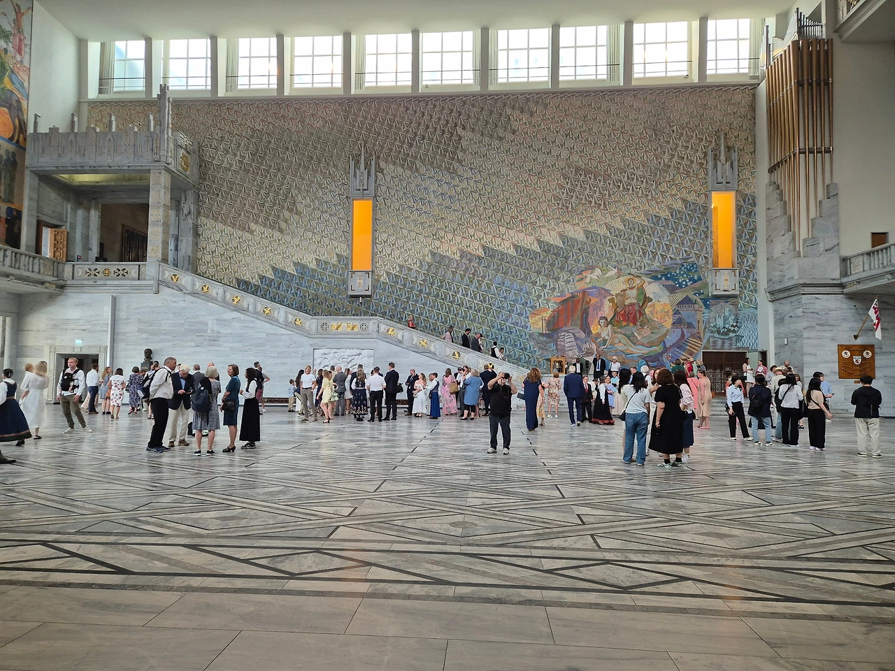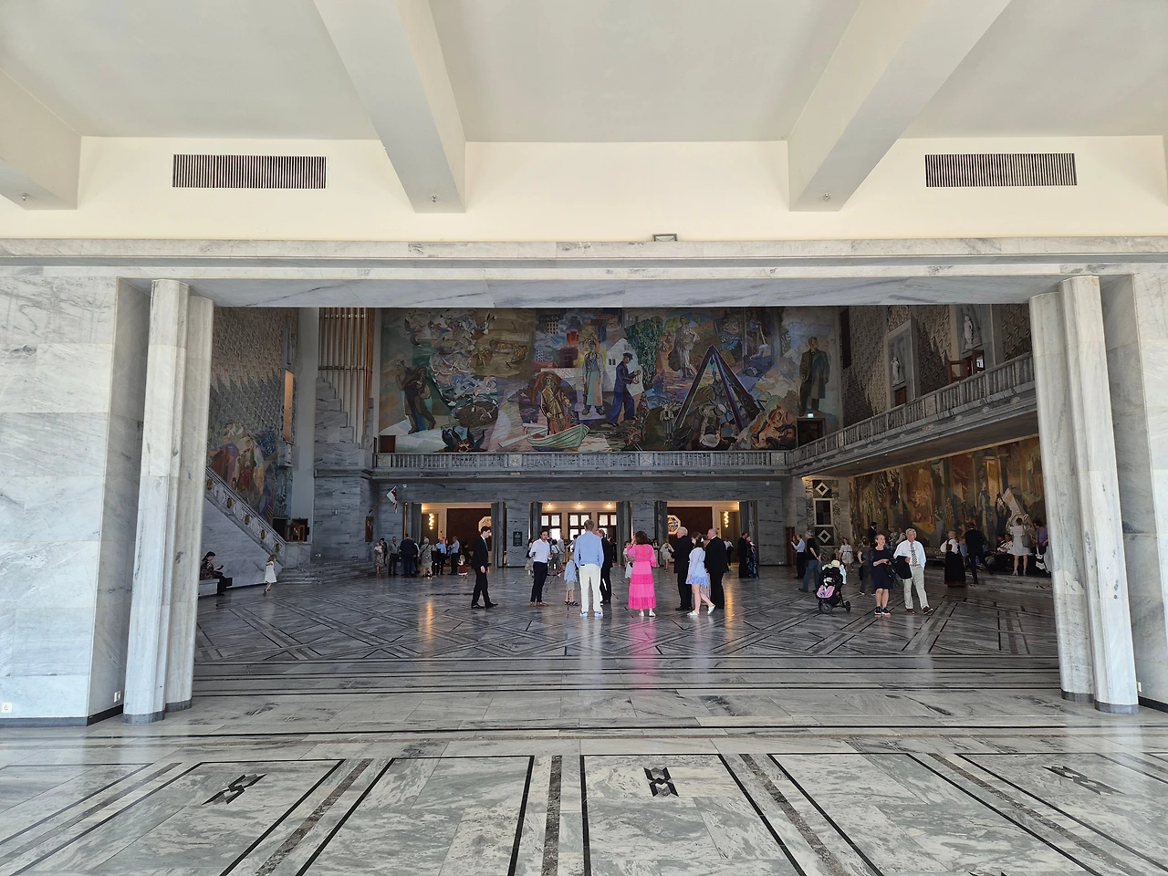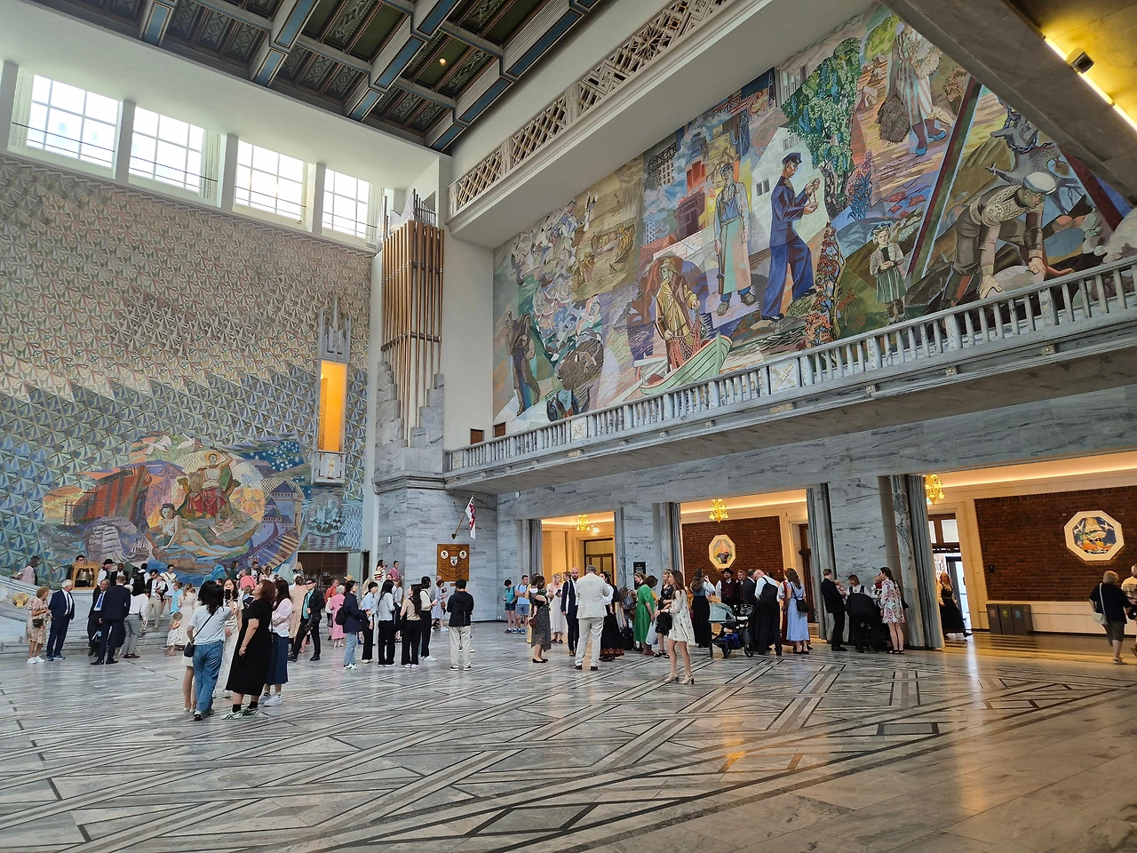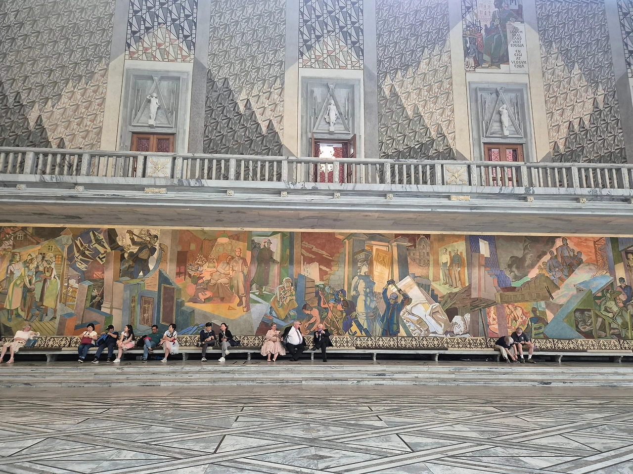 붉은 벽돌의 오슬로 시청사는 그간 보았던 유럽의 시청사들과는 달리 소박했다. 휴일에는 결혼식 장소로 무료 대관을 한다는데 우리가 방문한 날에도 결혼식이 있었다. 시청 안으로 들어서면 바로 나오는 넓은 홀이 노벨평화상 시상식 장소이다. 넓은 홀의 벽면을 채우고 있는 벽화들은 노르웨이가 꿈꾸는 이상적인 사회를 표현하고 있다고 했다. 그중 특히 노동자들을 그려 넣은 벽화가 눈길을 끌었다.