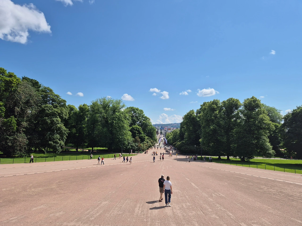 길은 완만한 경사로로 이어지며 양옆으로 넓은 숲의 왕궁 정원이 펼쳐졌다. 경사로 끝에는 왕이 거주하고 있는 노르웨이 왕궁이 있었고 왕궁 앞에서 뒤를 돌아보자 방금 지나온 길 위로 숲과 하늘이 맞닿아 있었다. 왕궁 앞 광장 중앙에는 스웨덴의 왕 칼 요한 14세의 청동 기마상이 있었는데 약 100년간 스웨덴의 통치를 받았던 노르웨이의 왕궁 앞에 스웨덴의 왕이라니. 게다가 메인 스트리트의 이름도 칼 요한 아닌가.