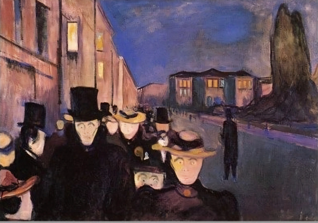 뭉크의 작품 중 <칼 요한 거리의 저녁>이 오래도록 마음에 남아 있었다. 이 작품에는 첫사랑의 실패와 아버지에 이은 남동생의 죽음, 파리 유학에서 돌아온 이후의 미래에 대한 뭉크의 불안이 고스란히 담겨 있다. 무엇엔가 크게 놀란 듯한 표정의 사람들이 창백한 얼굴로 무리 지어 걸어오는 모습에서 알 수 없는 두려움이 느껴졌다. 중앙에 등을 돌린 채 반대 방향으로 걷고 있는 사람이 뭉크다. 맨 오른쪽 형태를 알 수 없는 검은 물체는 나무를 그린 것이지만 거대한 그림자로 보였다. 한 평론가는 ‘뭉크의 작품에서 그림자는 실체를 알 수 없는 불안에 대한 공포를 나타낸다’고 했다.