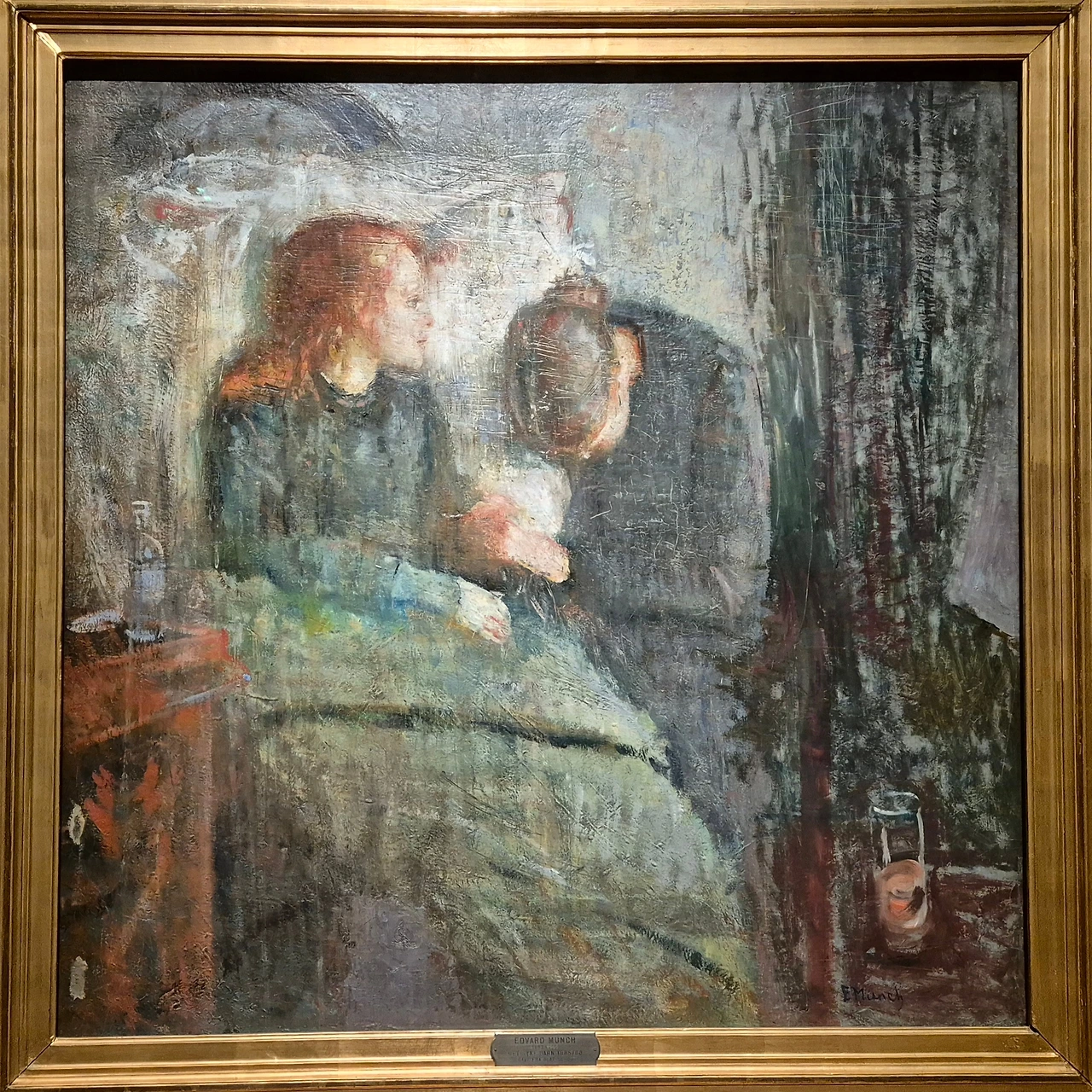 뭉크는 다섯 살에 폐렴으로 어머니를 잃었고, 의지했던 누이 소피에마저 15살에 폐렴으로 세상을 떠나자 소피에의 병상을 여러 작품으로 남겼다. <아픈 아이>를 마주하고 있으면 죽음이 느껴지는 숨죽인 고요 속에 깊은 슬픔이 배어 있음을 알 수 있다.