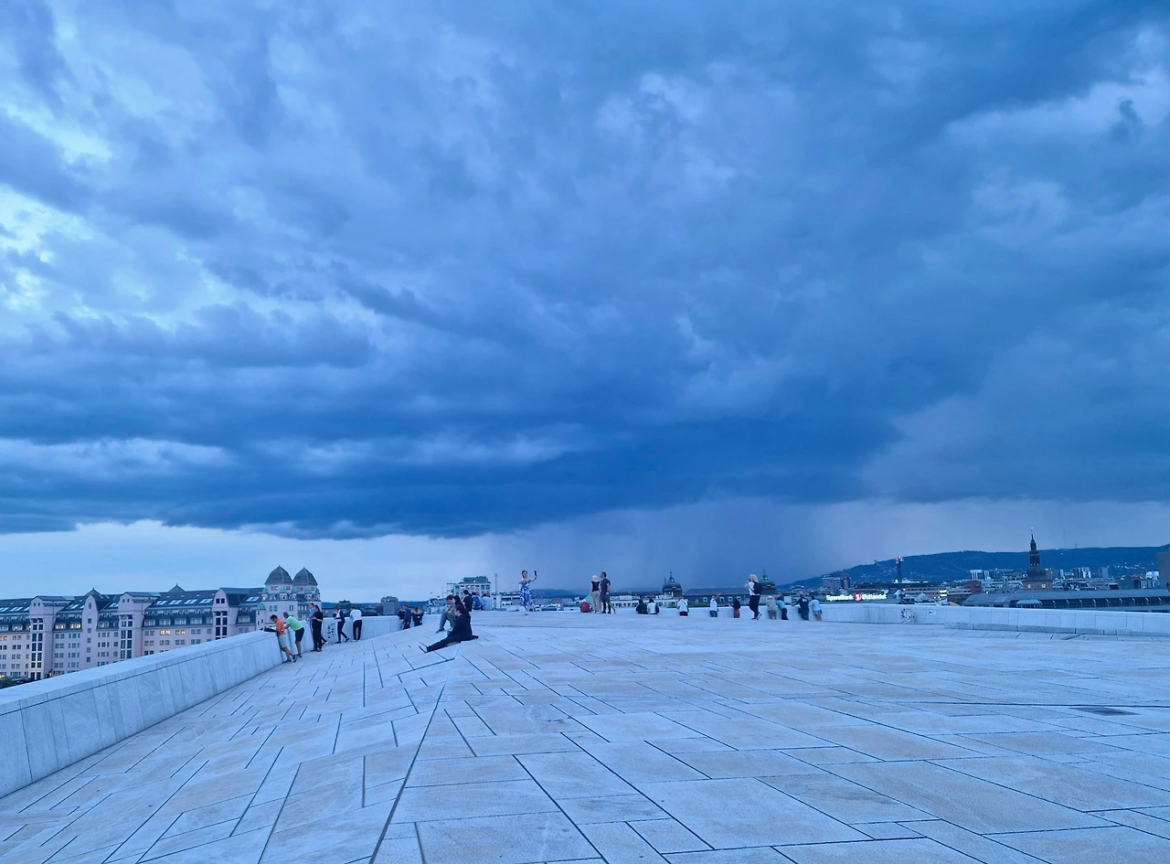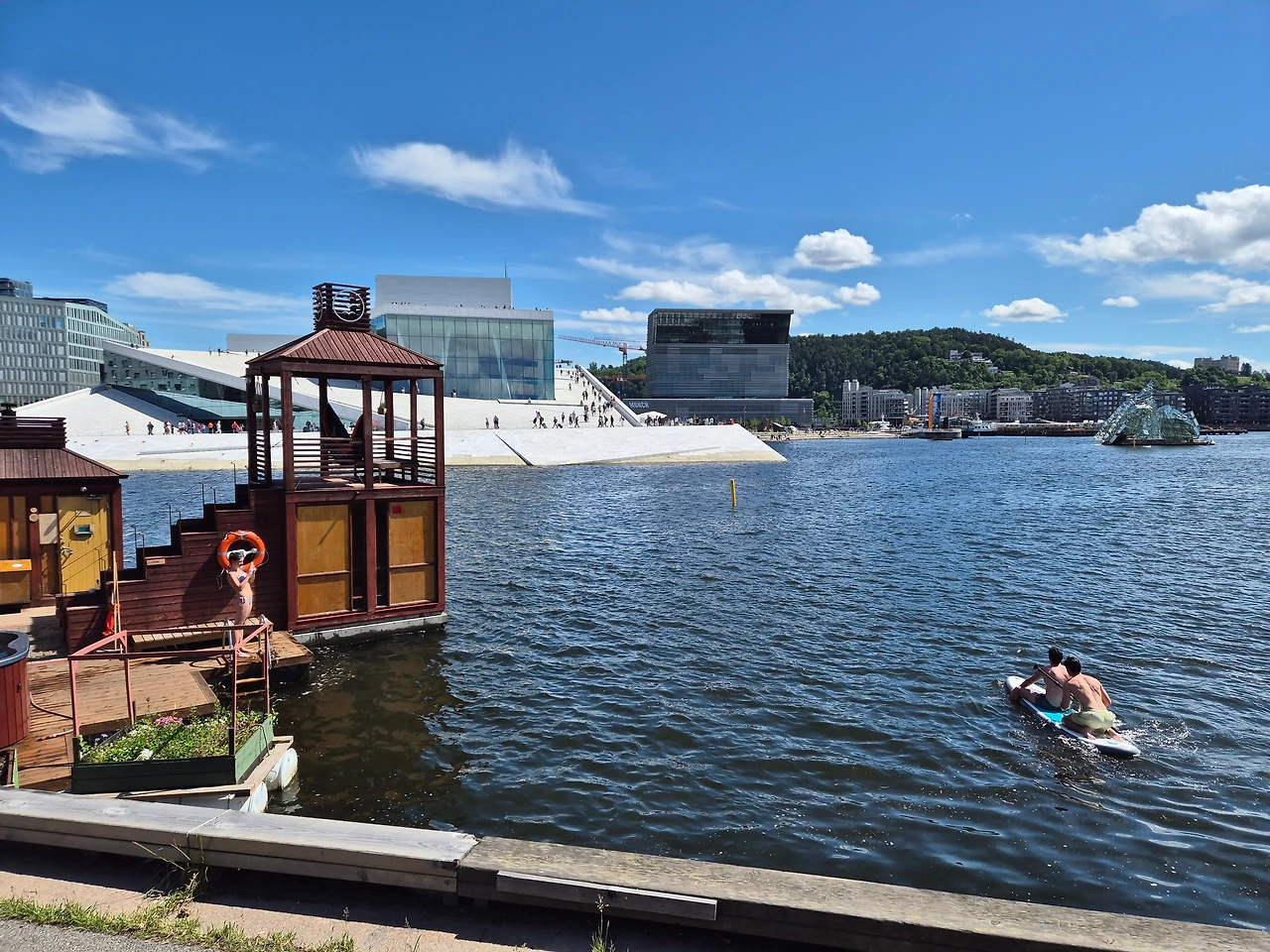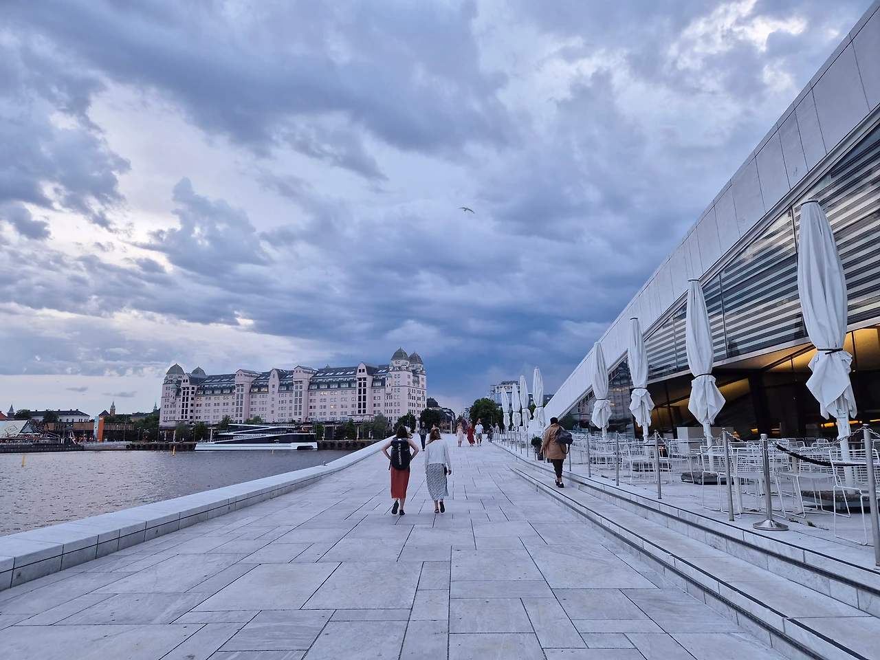숙소가 있는 아파트에는 주민들이 가끔씩 오갈 뿐 조용했고, 무지개 깃발을 내 건 발코니도 여러 곳 보였다. 하루 해걸음이 긴 것은 여행자에게 분명 매력적인 것이지만 자정이 가까워야 해가 지는 6월의 오슬로에서 노을을 보는 일은 긴 기다림의 시간을 필요로 했다. 저녁을 먹고 맥주를 마시며 느긋하게 해가 지길 기다렸다. 그리고 밤 10시를 지나 숙소를 나와 오페라 하우스 방향으로 걸었다.