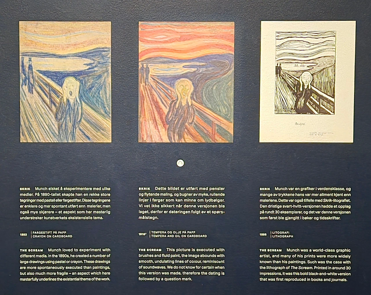 3가지 버전의 <절규>를 소장하고 있는 뭉크미술관은 세 작품을 30분 간격으로 번갈아 공개하고 있었다. 한 연구원은 이 작품의 제목인 <scream>을 ‘절규’가 아닌 ‘비명’으로 번역해야 적절하다고 했다. 대자연을 관통해 들려오는 비명을 들은 후 탄생한 작품이기 때문이다. 작품 속 뭉크는 대자연이 지르는 비명소리를 듣지 않으려고 두 손으로 자신의 귀를 틀어막고 있다.