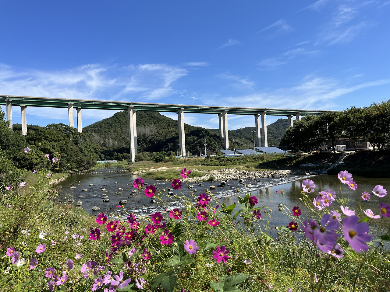 “야. 혜지야 얼른 내려봐. 여기 코스모스 있어~ 물 하고 다리하고 하늘 하고 너무 예뻐. 네가 딱 좋아할 스타일이야.”