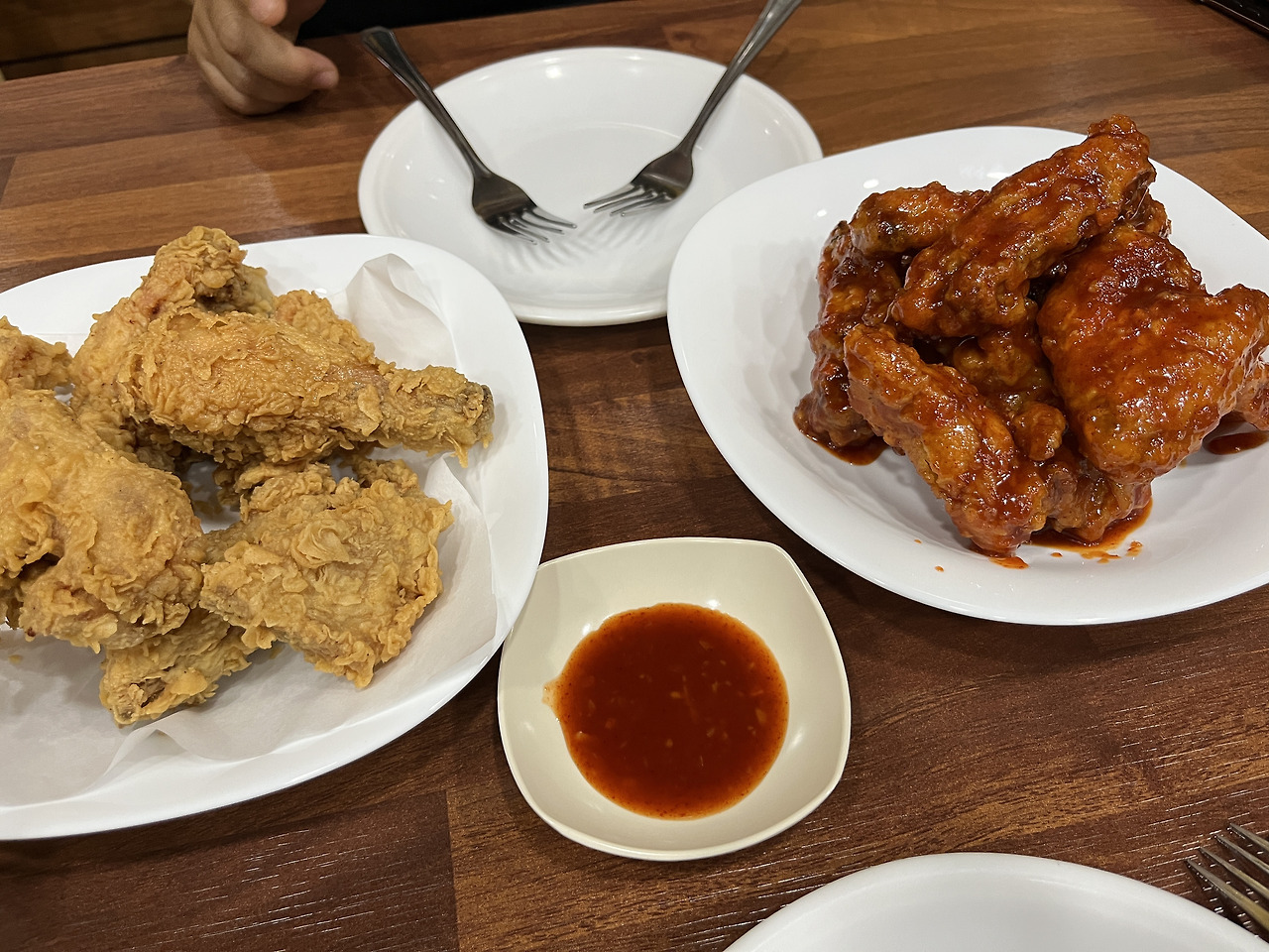 치킨이 나오고 퍽퍽 살을 찾아(둘 다 퍽퍽 살을 좋아한다.) 입에 딱 넣는 순간 “맛있다!. 딱 좋네.”라고 하며 치킨 한 마리를 다 먹었다.