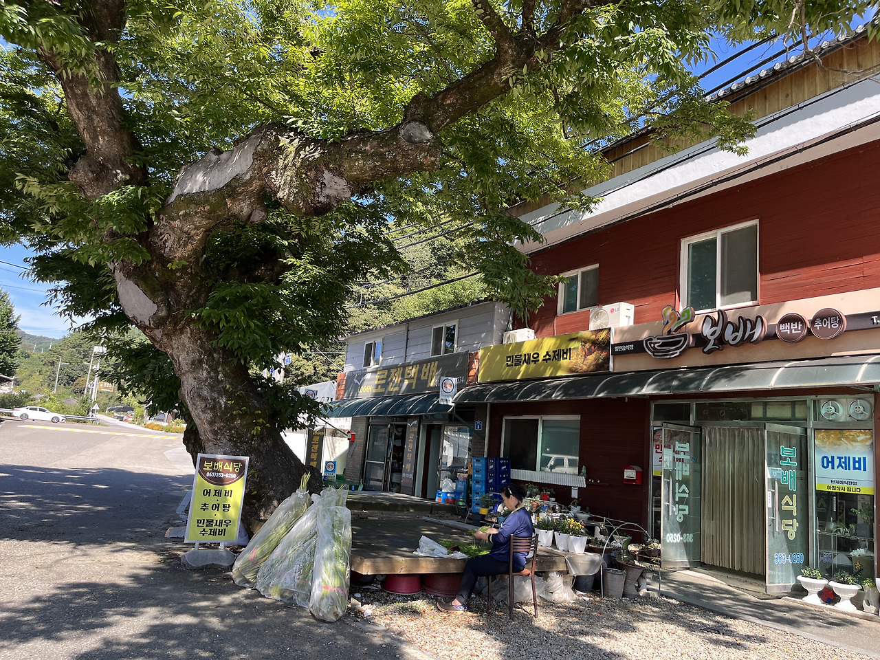 사장님은 큰 나무가 만드는 그늘을 지붕 삼아 평상에서 토란대를 다듬고 계셨다.