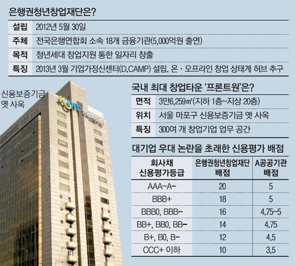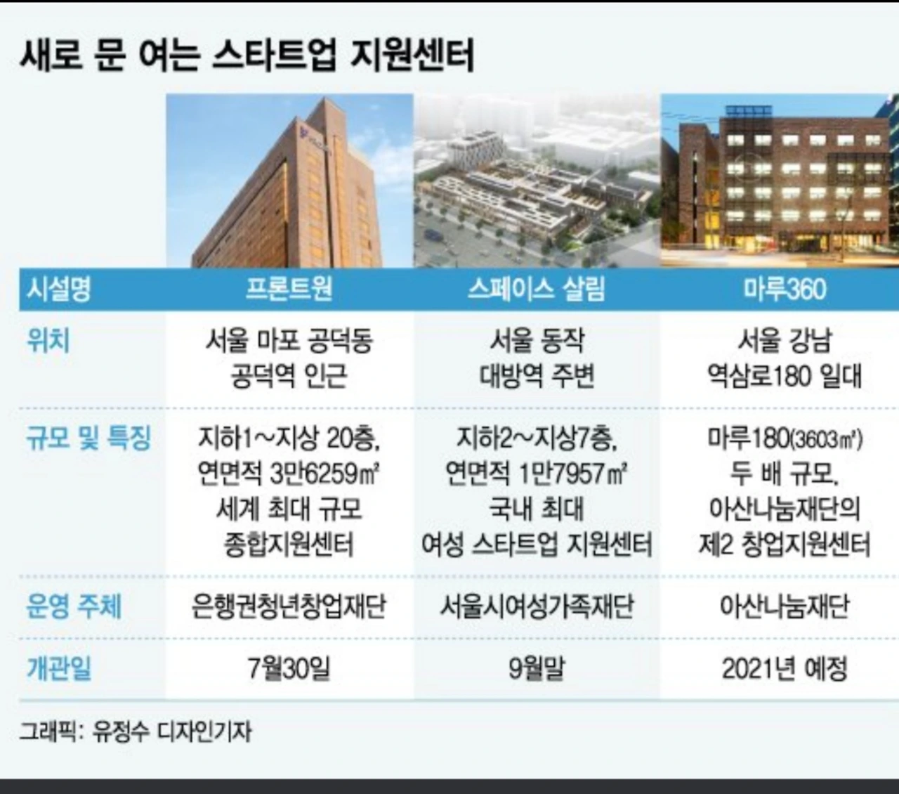 대표적인 창업지원형 공간 플랫폼인 프론트원은 민관합동 청년창업기업 지원 센터로 지난 2020년 설립됐다. 프론트원은 은행권청년창업재단의 복합 창업 생태계 허브인 디캠프를 중심으로 여러 액셀러레이팅 기관들이 함께 조성한 대규모 복합 창업지원 공간이다. 디캠프, 롯데액셀러레이터, 신용보증기금, 신한퓨처스랩 등 120여 개사가 입주해 있다. 디데이 입주심사를 통해 선발된 기업은 기본 6개월에서 최장 1년까지 입주가 가능하다. 1층과 3층 사이에 있는 네트워킹 공간에서는 로비, 카페, 전시공간, 구내식당, 공용 오피스가 있으며 창업 공간을 제외한 19층과 20층에는 복지공간인 피트니스, 샤워 및 수면실, 다목적홀, 옥상라운지가 있다. 프론트원은 기업의 성장 단계별 종합 금융지원과 함께 투자, 컨설팅, 교육, 해외진출 등 창업 전 분야를 패키지로 지원하고 있다. 특히 대학, 전문 교육기관과 연계해 채용·성장지원 프로그램, 전문 멘토와의 만남인 오피스 아워, 지자체 공공임대주택을 활용한 주거공간 등으로 입주기업의 경쟁력을 높이기 위해 노력하고 있다.