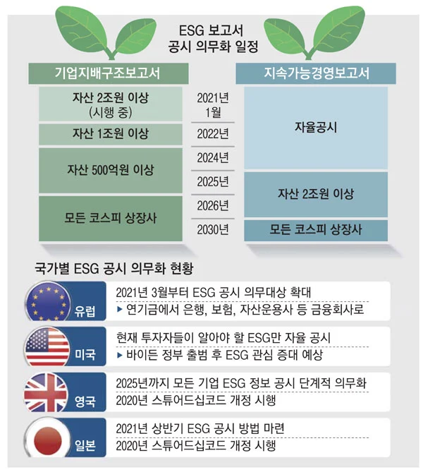 ESG공시는 2025년부터 단계적으로 의무화된다. 기업은 정보 취합을 위한 전사적 업무분장, 공시범위 확대 검토, 전사 IT 시스템 통합, ESG 데이터 관리 체계화, 사내 전문 인력 육성 등이 필요하다. 특히 EU 중심으로 ESG 정보 공시 규제·표준 도입이 가속화되고 있기 때문에 ESG 정보 공시는 단발성 대응이 아닌 체계적 대응 준비가 필수적이다.