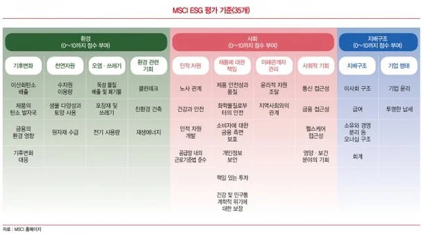 그다음으로 우리 기업이 채택하고자 하는 ESG 평가 기준을 선택해야 한다. 대표적으로 MSCI ESG 평가 기준이 있다. MSCI 평가 기준은 매년 전 세계 8500여개 상장기업을 업종별로 나눠 환경, 사회적책임, 지배구조와 관련한 경영 현황을 평가하고 있다. 총 10가지 테마와 37개의 키 이슈로 구성돼 있다. 10개의 테마는 세부적으로 환경(E) 분야의 ▲기후변화 ▲천연자본 ▲오염·폐기물 ▲환경적 기회, 사회(S) 분야의 ▲인적자본 ▲제품 책임 ▲이해관계 상충 ▲기회 균등, 거버넌스 분야(G)의 ▲지배구조 ▲기업행동 등으로 구성된다.