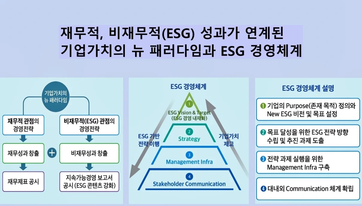 물론 기업 입장에서도 이러한 ESG 측정 지표를 잘 활용하면 기업의 비즈니스 가치사슬에서 미래의 경제적 가치를 창출해 낼 기회를 발견할 수도 있다. 하지만, 기회를 발견하기 위해서는 단순한 지표 측정 대응을 넘어서 ESG를 내재화하고 비즈니스 가치사슬에서 발생 가능한 리스크와 기회를 체계적으로 관리할 수 있는 지속가능경영 전략 수립이 필요하다.