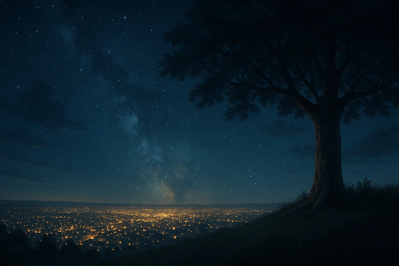 도시가 내려다보이는 커다란 나무 아래, 둘은 나란히 걸터앉았다. 발밑엔 형형색색의 불빛들이 바다처럼 넘실거렸다. 그 불빛은 마치 밤하늘의 별을 거꾸로 쏟아부은 듯 찬란하게 빛났다.