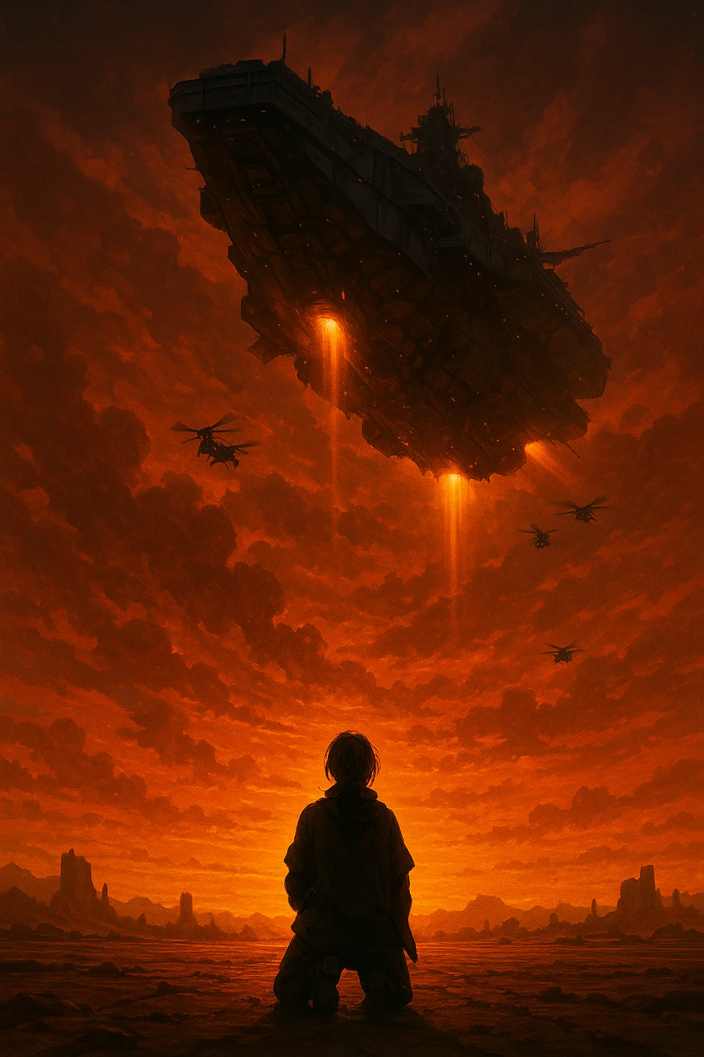 대기권의 불길을 가르며, 거대한 공중항공모함이 느릿하게 내려오고 있었다. 그 장엄한 그림자가 협곡 위에 드리워졌다.