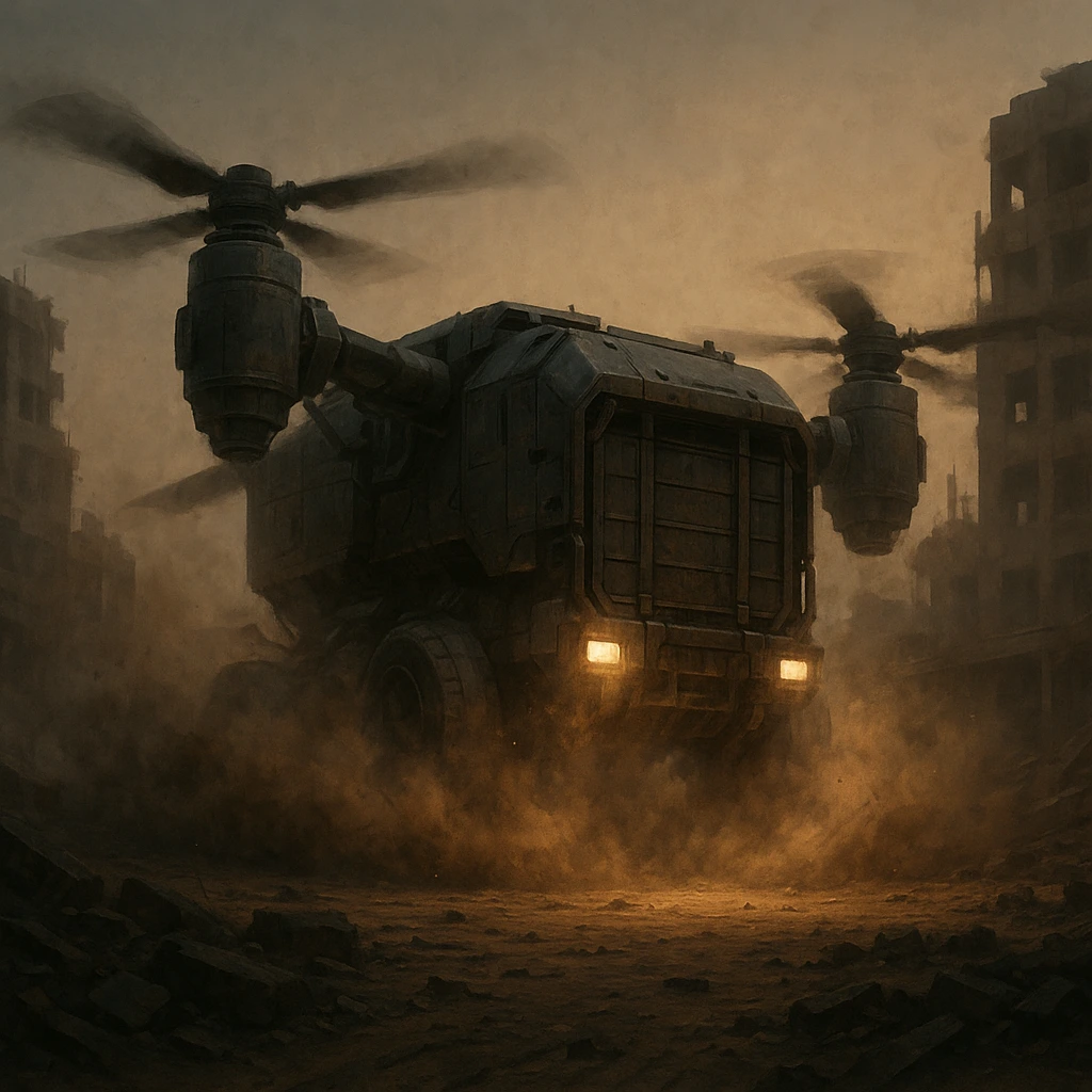 그리고 잠시 후, 고요했던 빈민가의 하늘을 가르며 거대한 화물 드론 한 대가 묵직한 로터음을 울리며 다가왔다. 그리고 흙먼지를 소용돌이치며 우리의 앞에 천천히 내려왔다. 낡은 건물들 사이로 불빛이 쏟아졌고, 덜컥거리는 기계음과 함께 적재함의 해치가 삐걱이며 열렸다.