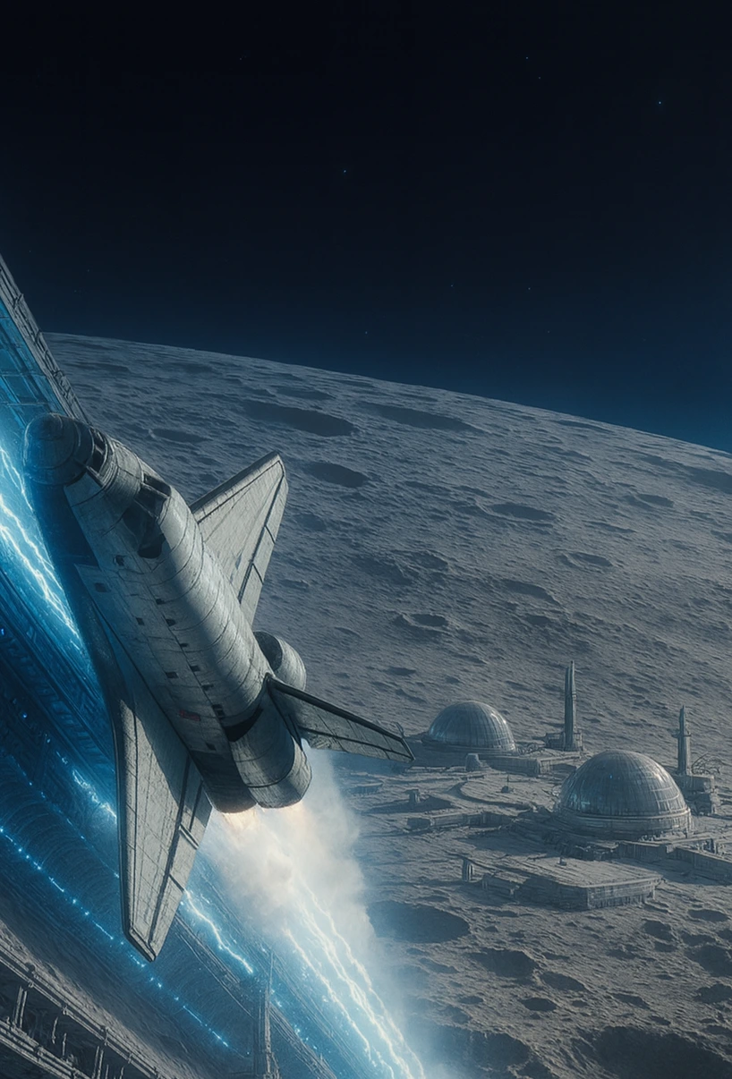 딜런의 외침이 울렸고, 그다음 순간, 셔틀은 폭발하듯 앞으로 나아갔다. 레일을 따라 셔틀이 수직상승을 시작하자, 달의 지면이 시야 아래로 내려앉기 시작했다.