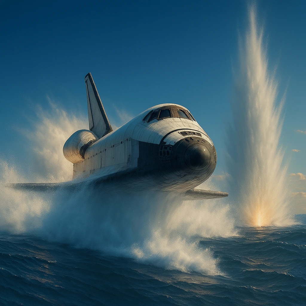 딜런이 외치며 버튼을 누르자 셔틀의 아래쪽 노즐에서 거센 흰 연기가 뿜어져 나왔다. 공기가 만들어낸 거센 충격파가 바닷물을 밀어내며 물의 구덩이를 만들었고, 셔틀은 순간 바다 위 멈춰 선 배처럼 두둥실 떠올랐다. 공기 저항을 이용한 급상승이 이루어지자 기체는 휘청거리며 다시 하늘로 고개를 들었다. 셔틀의 바닥이 해수면의 경계에 아슬아슬하게 스쳐갔다.
