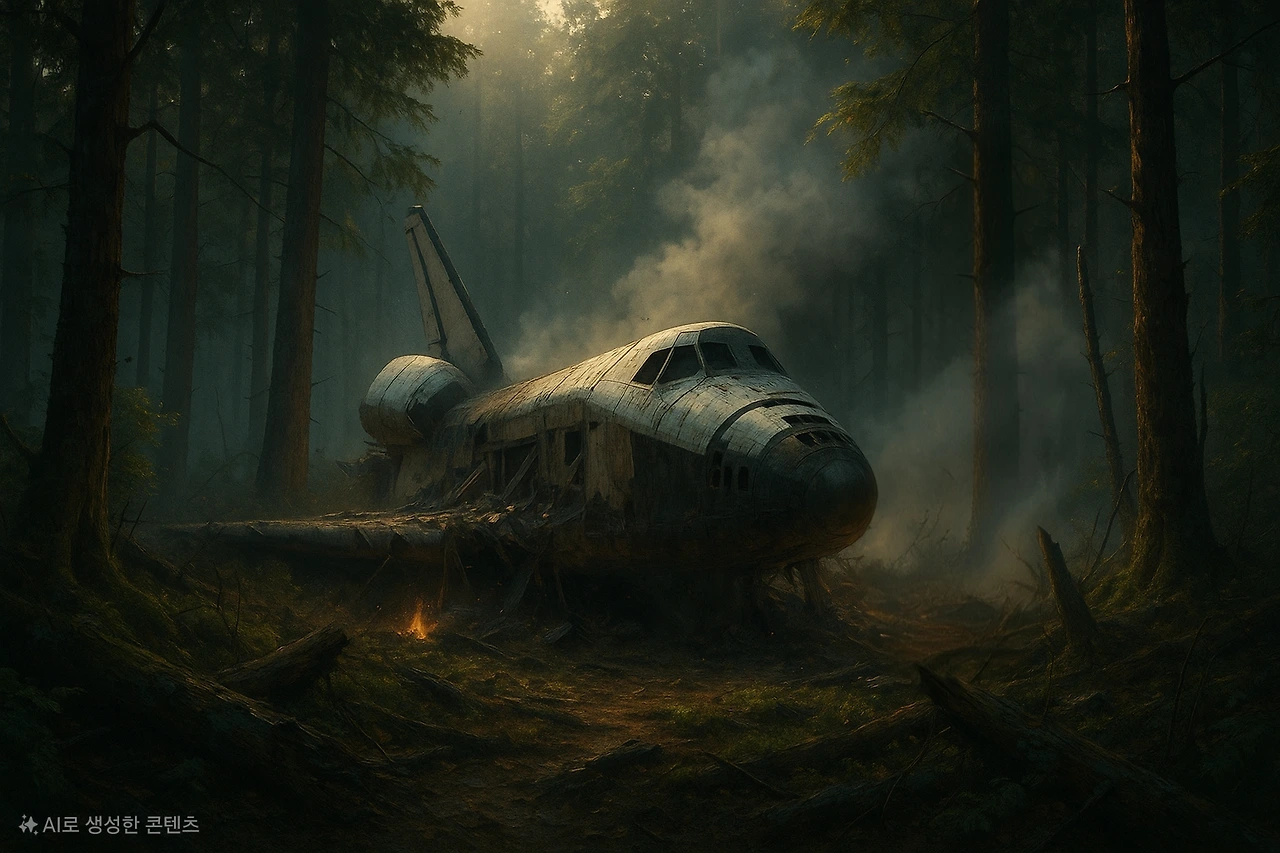셔틀은 한참을 미끄러지다가 거대한 바위에 부딪히며 요란한 금속음과 함께 멈춰 섰다. 마찰 열 때문인지 낙엽 타는 냄새가 은은하게 새어 들어왔다.