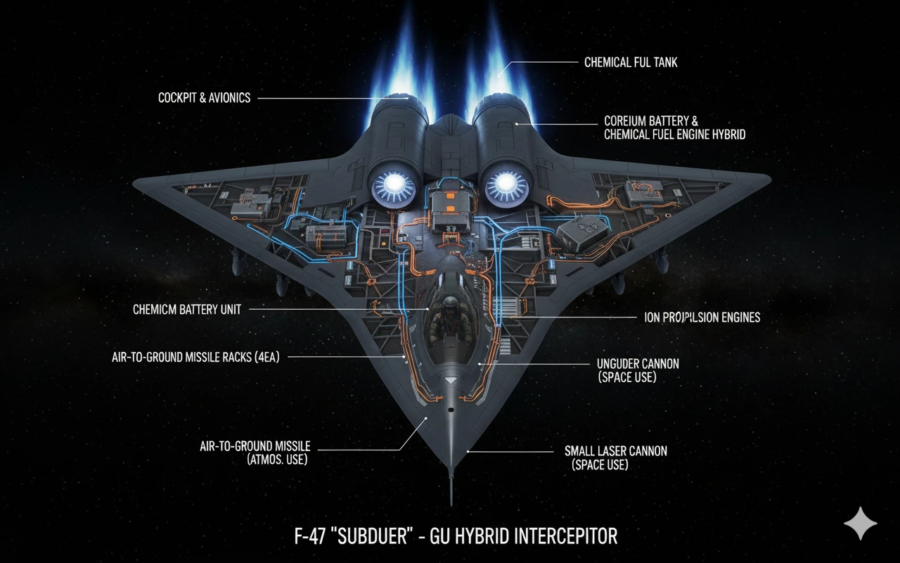 F-47 Subduer는 지구 구시대 미군이 개발한 F-42 우주전 전투기의 설계를 계승한, GU의 주력 유·무인 복합 다목적 전투선이다.