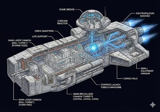 루나급 초계함은 루나포트 자동화 조선소에서 대량 생산되며, 주조된 기본 프레임 위에 강화 신소재 외피를 덧댄 후, 무장·센서 모듈을 장착하는 모듈형 준표준 설계를 채택하고 있다.