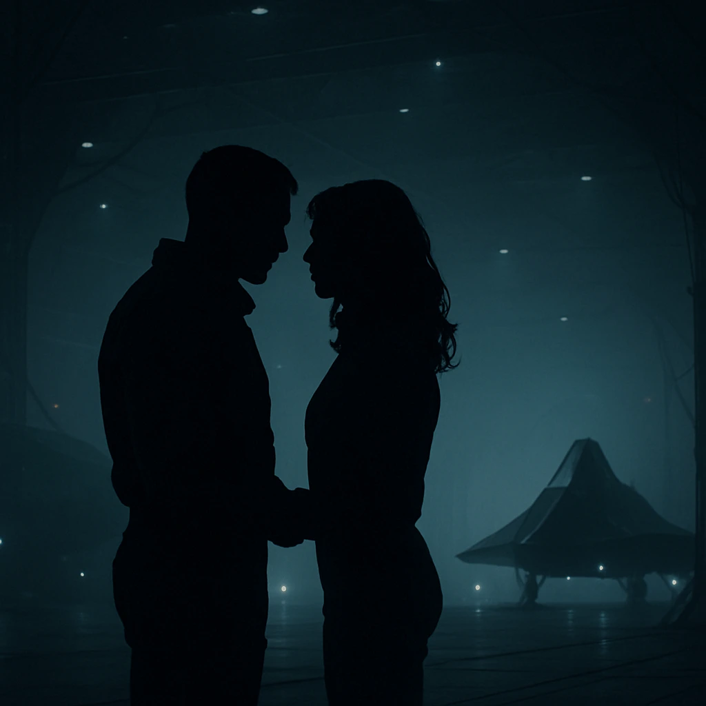 둘은 한동안 말없이 서로를 응시했다. 칼리뮤가 숨을 고르듯 천천히 들이쉬고, 노라는 격납고 천장의 흔들리는 조명 아래서 그녀의 얼굴을 바라보았다.