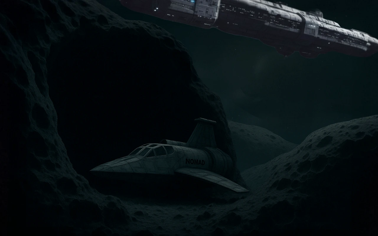 나는 본능적으로 노매드의 추력을 낮추며 근처에 보이는 대형 소행성을 향해 기수를 돌렸다. 노매드는 천천히 소행성의 그림자 속으로 스며들었다. 대형 소행성의 표면은 수많은 충돌 흔적으로 뒤덮여 있었고, 한쪽 면에는 거대한 크레이터가 입을 벌리고 있었다. 나는 즉시 그 안으로 기체를 밀어 넣은 뒤, 시동을 정지시켰다.