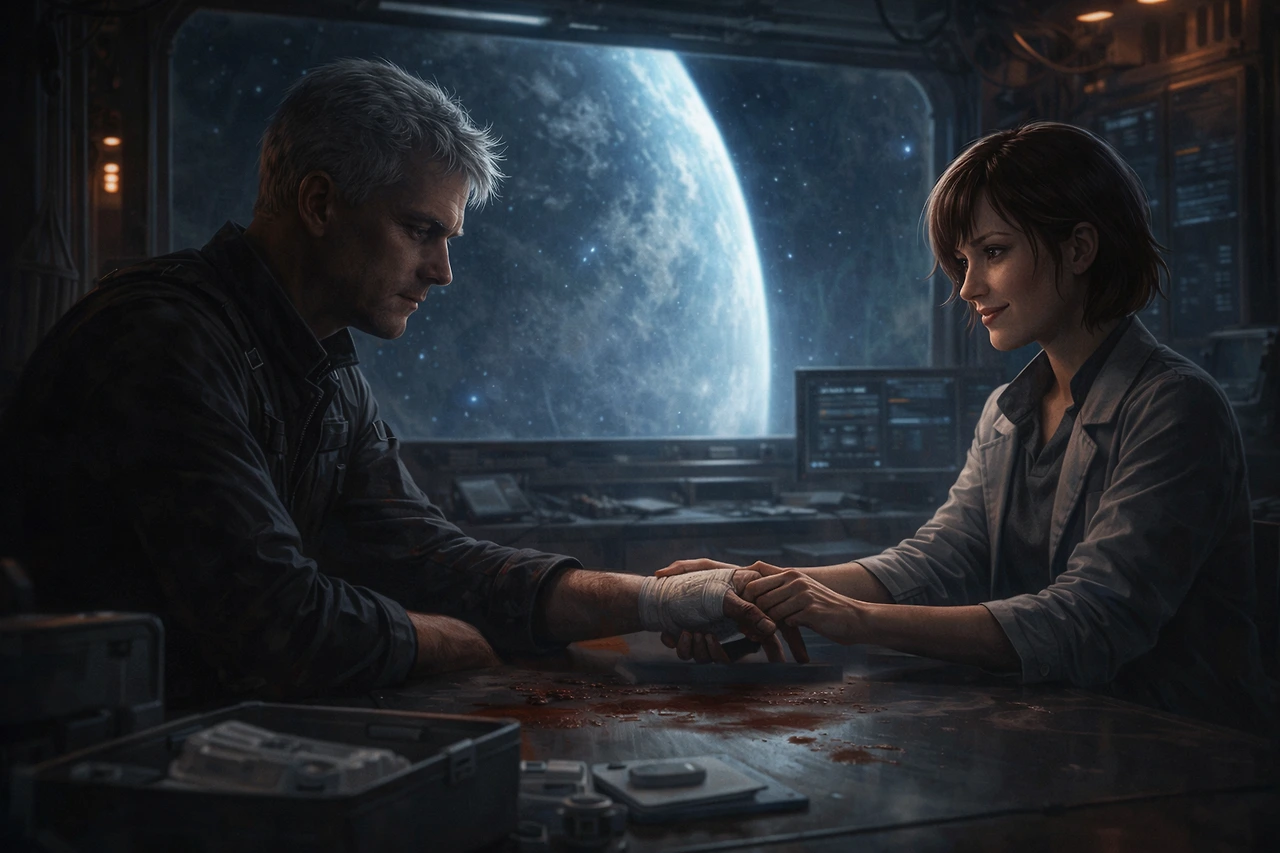 그녀는 구석에서 구급상자를 가져왔다. 로쉬는 말없이 그녀에게 손을 내주었다. 하린은 정성스럽게 그의 상처를 봉합했다.