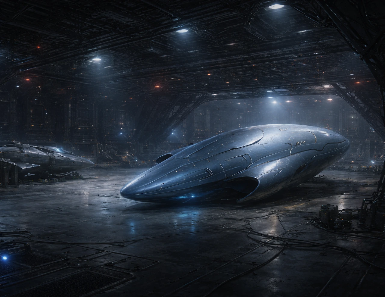 격납고는 고요했다. 거대한 공간을 채우고 있어야 할 기계음과 작업 신호는 대부분 꺼져 있었고, 천장 레일에 매달린 작업용 조명만이 간헐적으로 깜빡이며 바닥에 긴 그림자를 늘어뜨리고 있었다. 붉은 경고등이 벽면을 타고 흐르듯 점멸했고, 그 사이사이로 네리안 함선의 유선형 선체가 낮은 숨을 쉬듯 미세한 진동을 내뿜고 있었다.